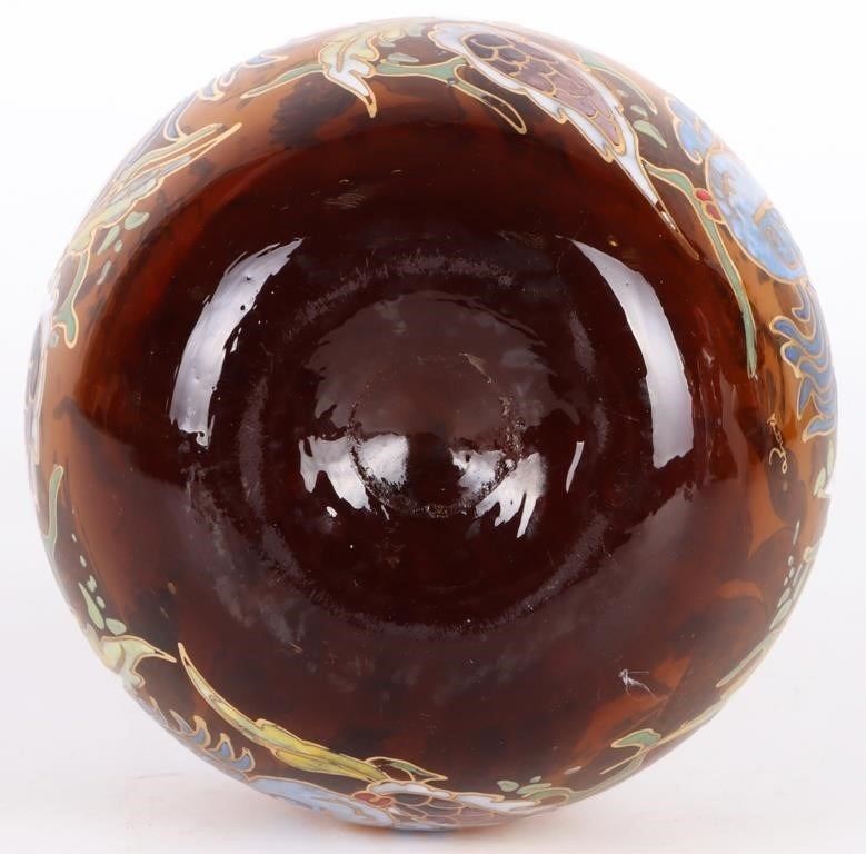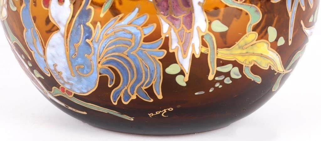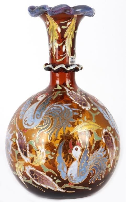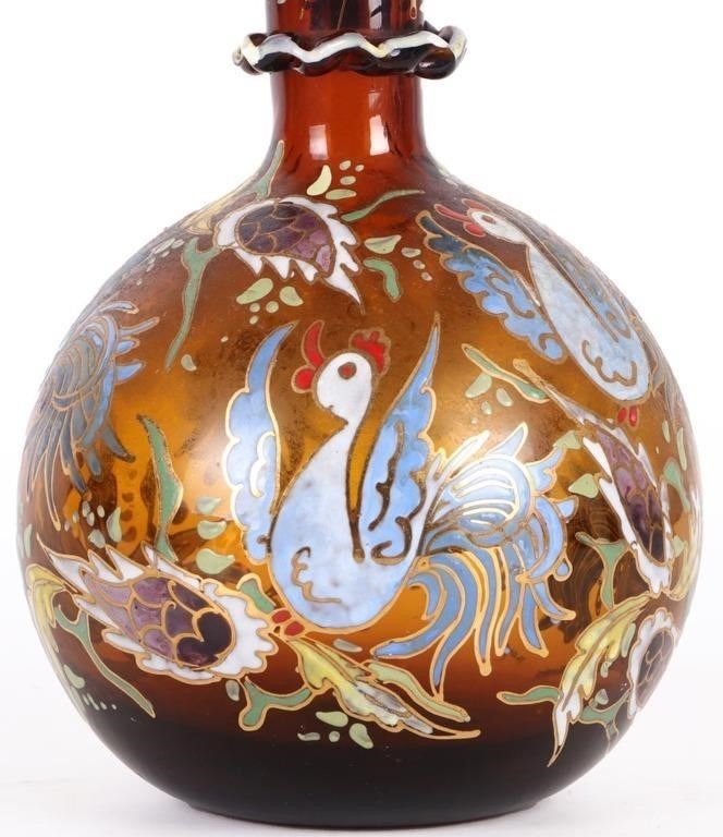 Vintage Royo enameled glass crystal glass bird amber vase made in Spain.