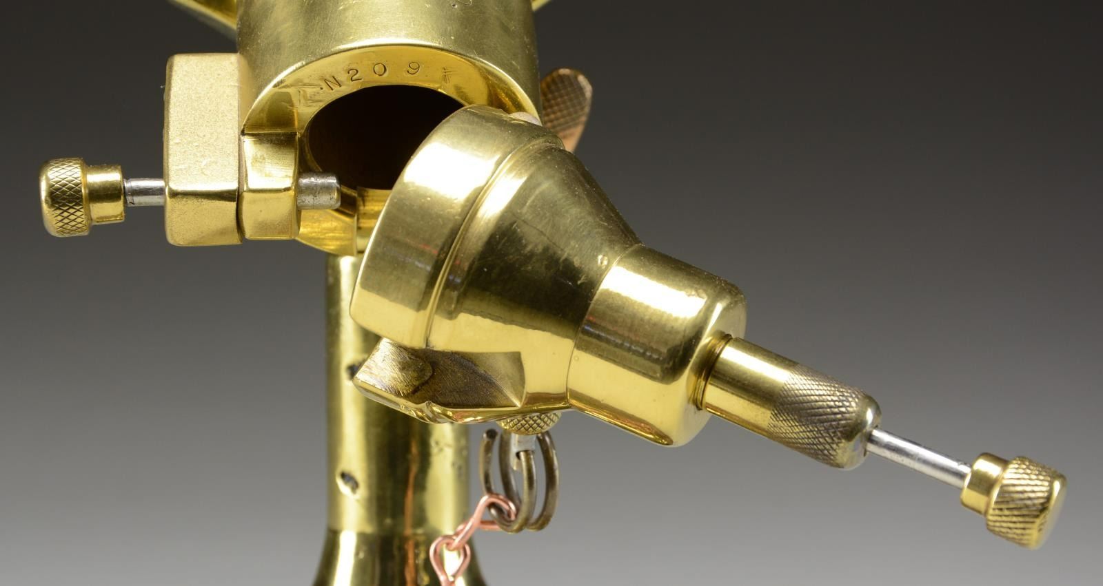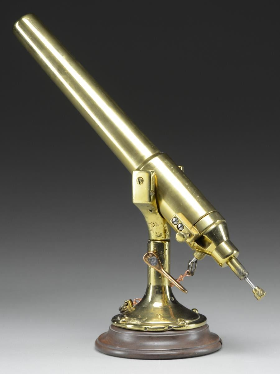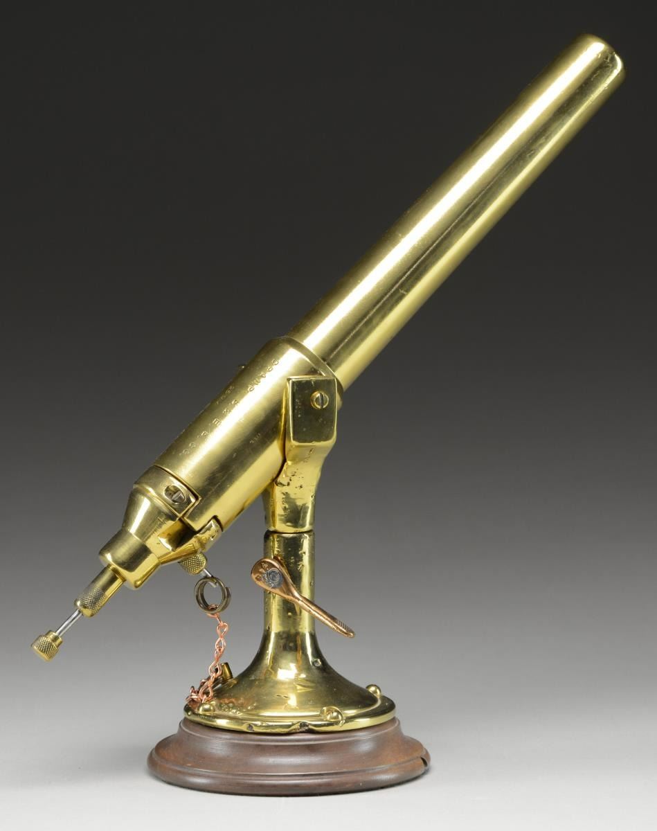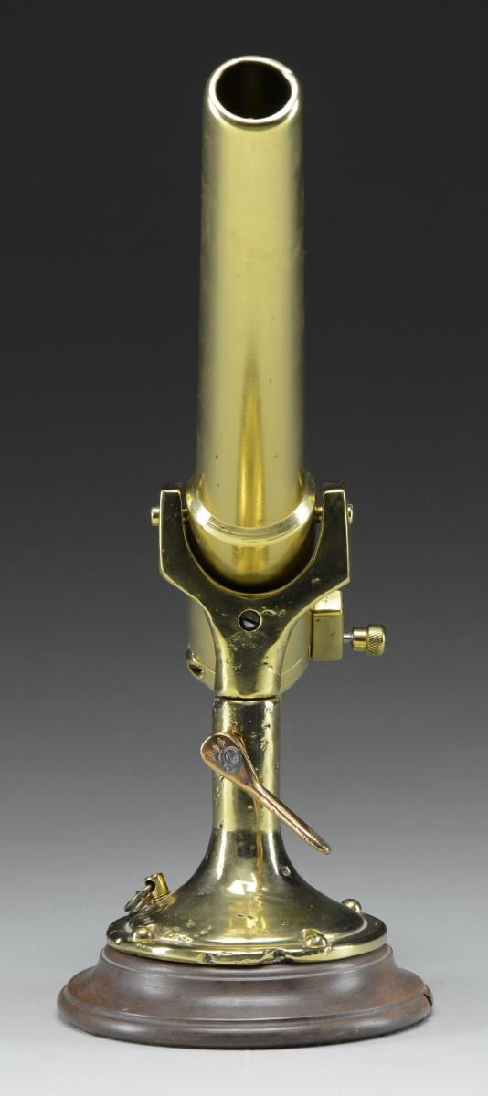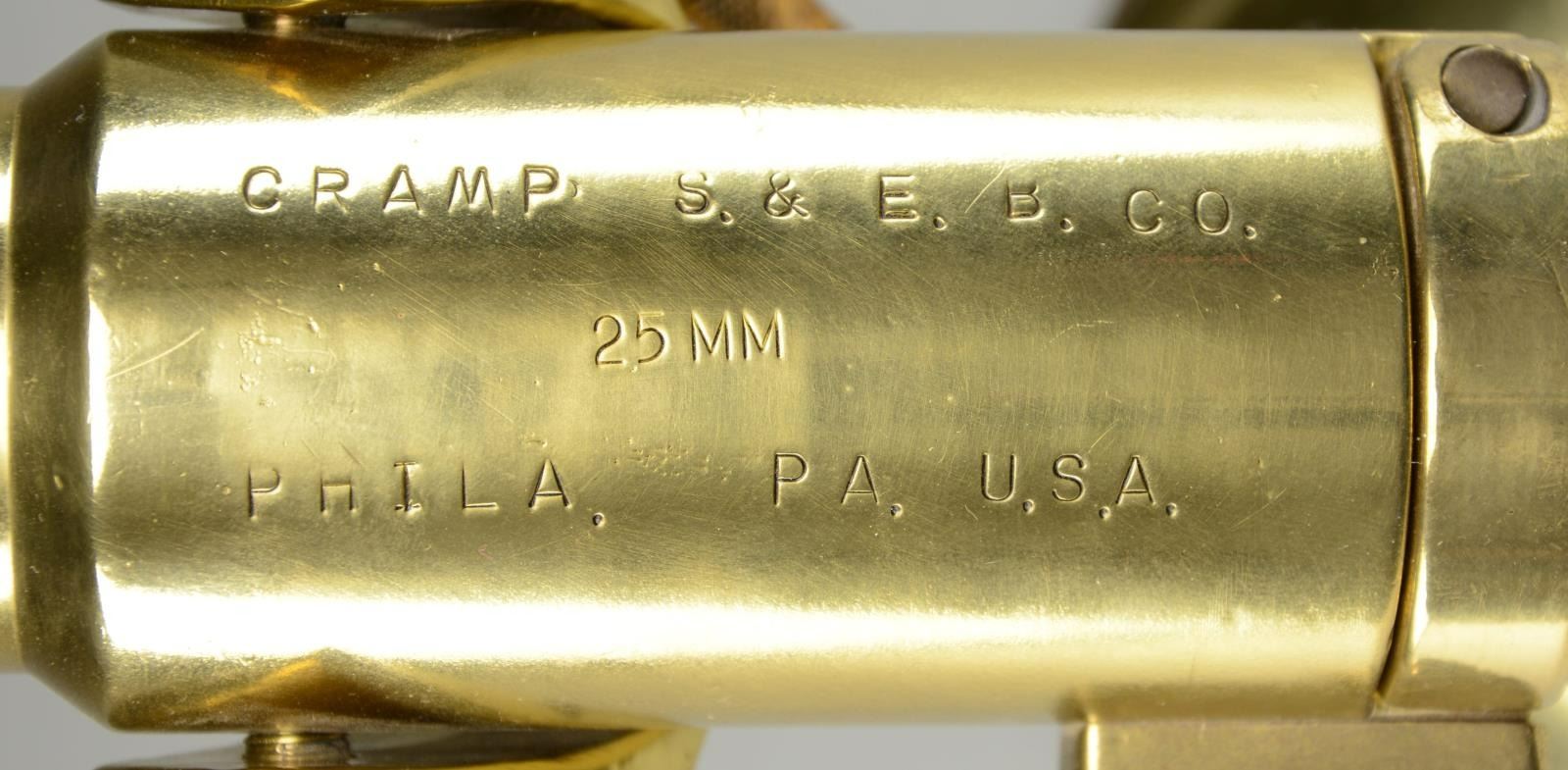 Breech loading deck cannon 13" bbl. appearing cast bronze (or brass) & nonmagnetic stainless. Pin latched breech block. Rear of chamber & breech block marked "N209" plus crown proofs w/ 3 points at top of crown. Distinct anchor on rear of barrel. Marks not visible w/ action closed. Fired by hand cocking striker & releasing spring loaded sear pin. Type of signaling device used on submarines, etc. Marked "CRAMP. S. & E. B. CO. / 25MM / PHILA. PA. U.S.A." Cramp was shipbuilding company in Philadelphia started in 1830 & very active during WW I. It became idle in late 1920's; reactivated for WW II to make submarines & cruisers. Copper lever (#348) to lock swivel. Decorative copper chain added where lanyard to fire would be routed. Attractive walnut base from table lamp. CONDITION: very good appearance; normal casting flaws visible in base & pintle. Fully functional w/ good bore. Replacement of springs throughout would be beneficial. (02-20987/NW). NON-GUN. $800-1,200.