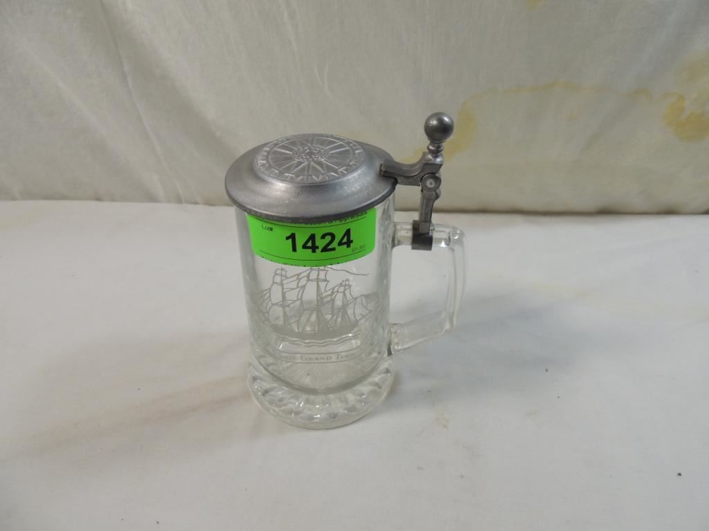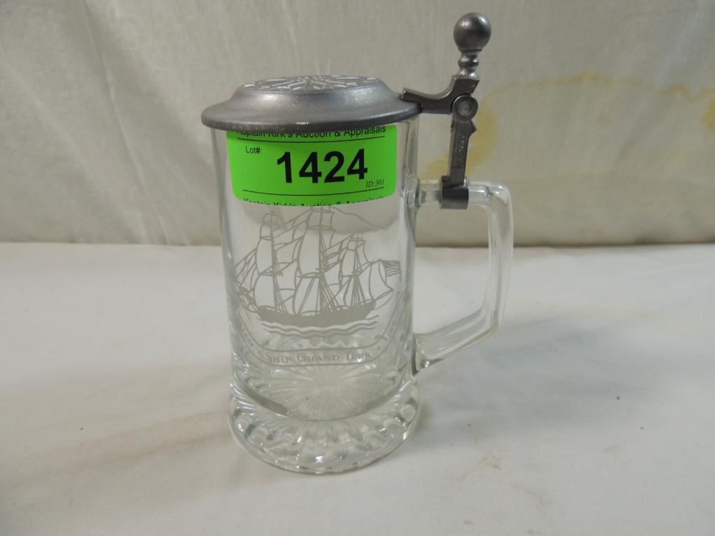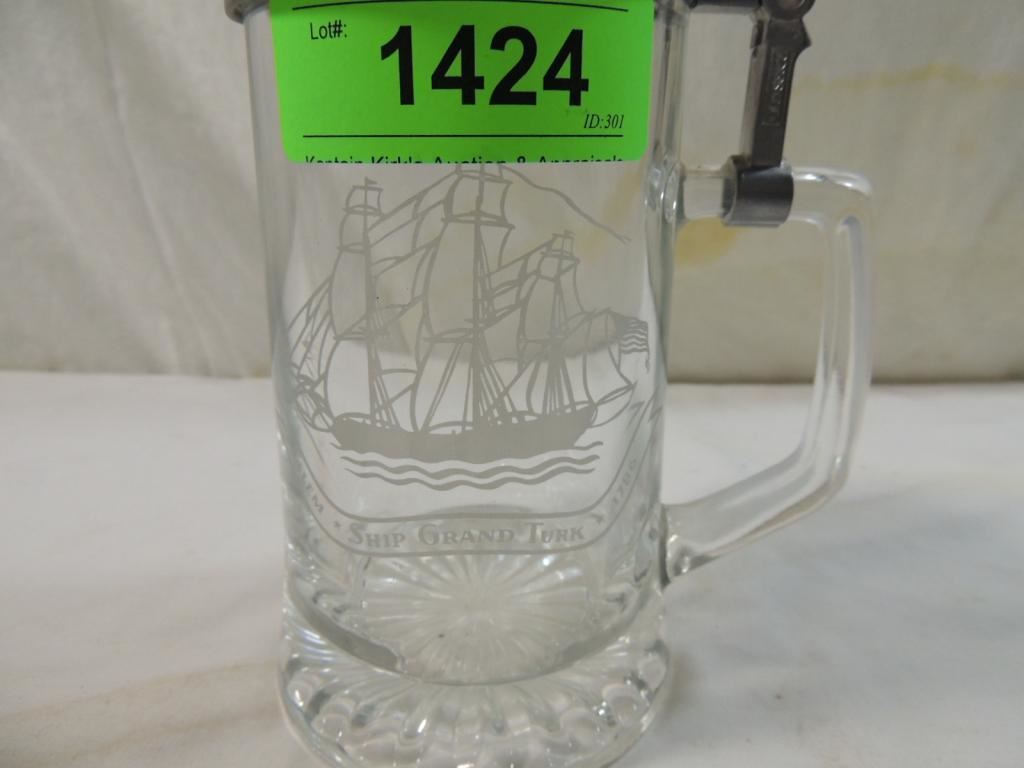 1786 SALEM SHIP GRAND TURK GLASS STEIN PEWTER LID ETCHED GLASS SHIP DESIGN AS SHWON SEE PHOTO FOR MORE DETAILS.