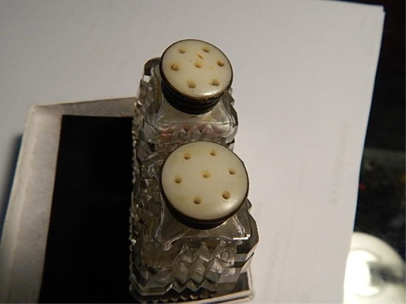 VINTAGE SALT & PEPPER - SILVER & GLASS & IVORY? AND RETRO SALT & PEPPER (RED TOPS) = 2 SETS TOTAL