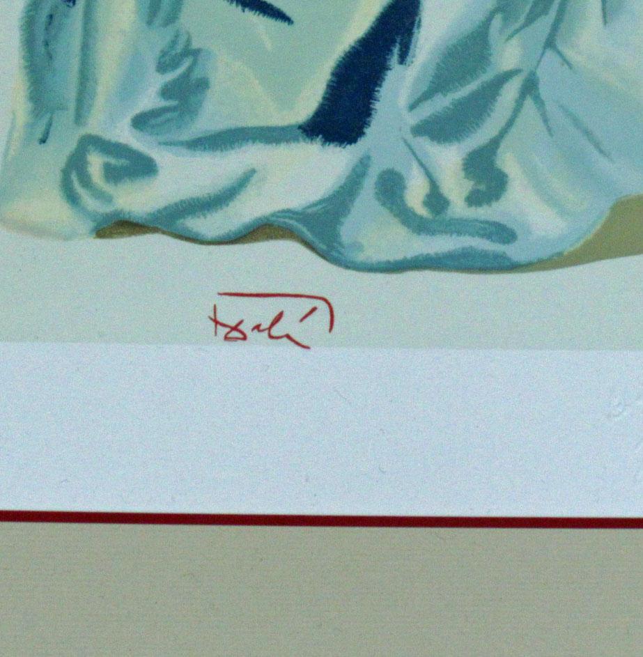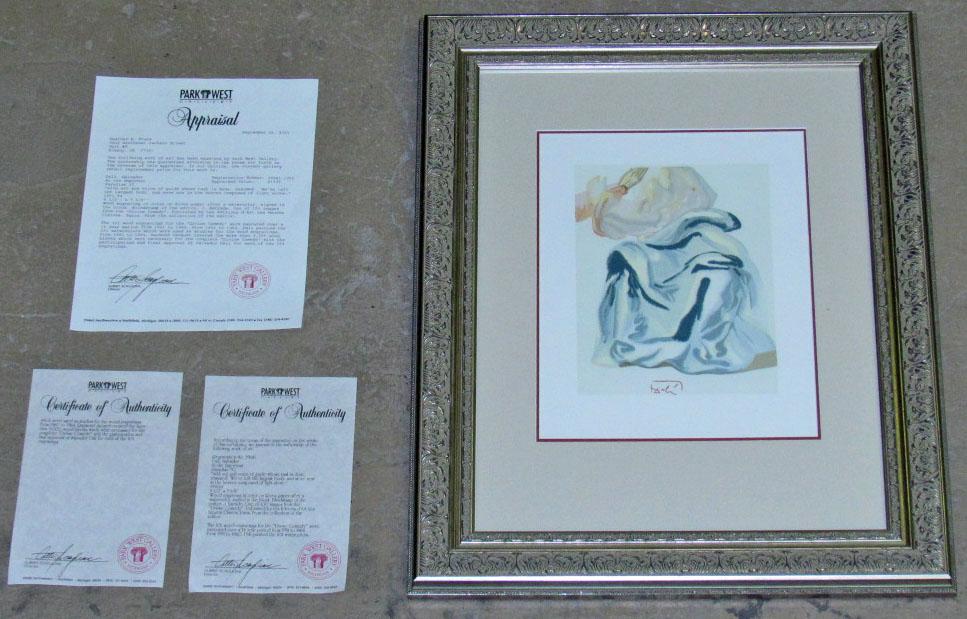 Comes with Parkwest Gallery appraisal of $1375. Titled At the empyrean paradise 30 "With act and voice of guide whose task is done, resumed: we've left the largest body, and move now in the Heaven composed of light alone: "1951 to 1964. Wood engraving in color on rives paper after a water color, signed in the block. Blindstamp of the editor J. Estrade. One of the 100 images from "The Divine Comedy". 101 wood engravings were excuted Dali painted the 101 water colors which were used as studies for the wood engravings, more than 3000 wood blocks which were necessary for the complete "Divine Comedy" with the participatation and final approval of Salvador Dali for each of the 101 engravings.