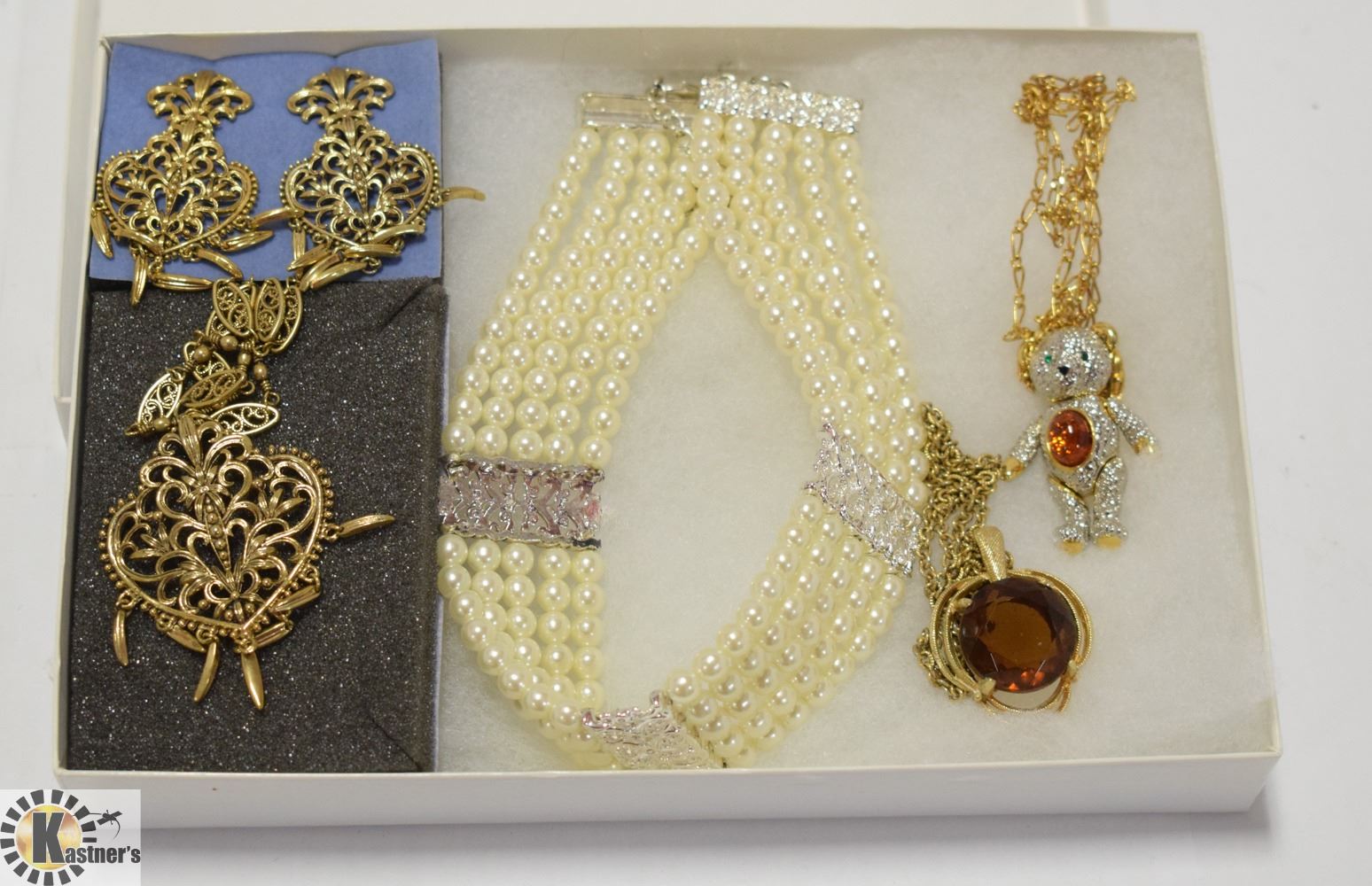 BRACELET, MATCHING NECKLAE EARRING SET, MOVEABLE BEAR WITH RHINESTONES