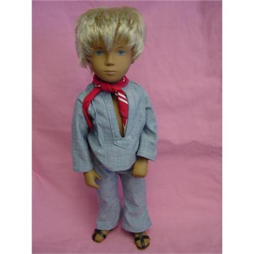 Vintage Sasha Blonde Gregor, Trenton, England, Mint in Box. This beautiful blonde boy is 16inches tall, never been played with or had hair combed. He is in mint condition along with original box. He wears a blue denim suit and red bandanna around his neck. He is a treasure to cherish in this condition and surely a great addition to your doll collection! (Item #80000155)