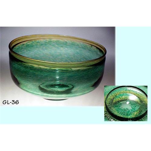 If you are REALLY interested in this item, please note that for Ebay Live Auction only bids at or above $130 will be successful and meet our reserve. This great looking Art glass bowl is a little mystery for us.... It was suggested that the origin was most likely in one of the Scandinavian glass houses, probably Kosta Boda. Controlled transparent green spatter layer is fused to the outer colorless glass. The top rim is fused with amber color glass layer. It has ground pontil, which is found on a good quality glass. Dimension : 5 3/4" in diameter, the front of the bowl is 3-1/8" high, back is 3-3/4" high. We took the photo sideways, showing the difference in height between the front and the back. Excellent condition, circa 1950's. Please note that in some cases photo sizes are automatically reduced, so if you want to see full size or detailed pictures, please email us ().