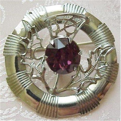 LOVELY VINTAGE ROUND BROOCH FEATURING THISTLE FLOWER AND A LARGE PURPLE GLASS STONE,IT IS FINISHED IN A SILVER TONE FINISH, MEASURES ABOUT 1 1/2" IN DIAM., EXCELLENT CONDITION, US BUYER TO PAY 7.00 FOR SHIPPING PLUS INSURANCE.THANKS