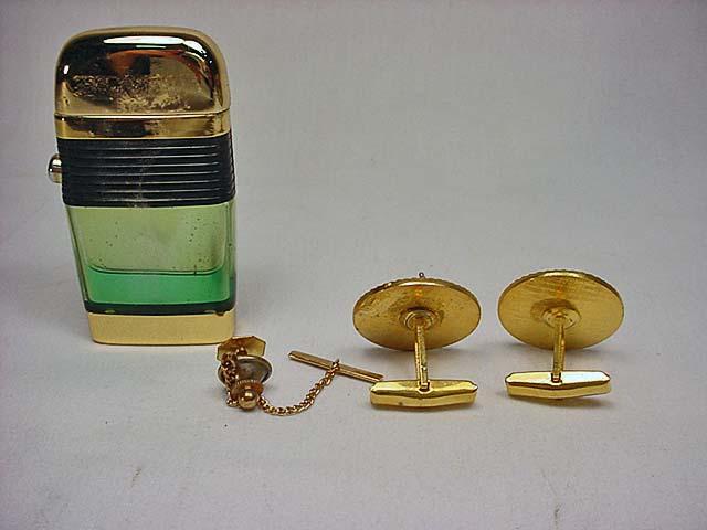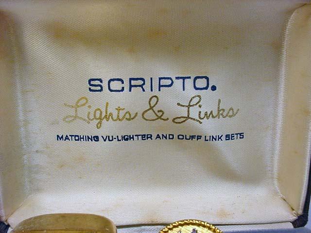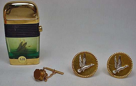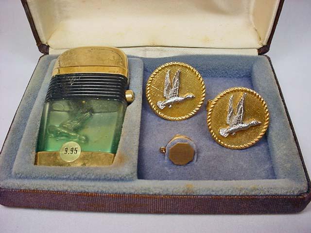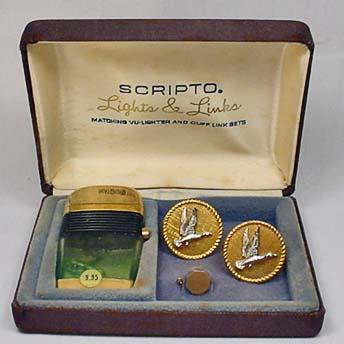 VINTAGE SCRIPTO LIGHTS AND LINKS SET IN ORIGINAL BOX - Duck themed. Never used. Incl. vu-lighter, cuff links and tie pin. Lighter appears to need a flint.