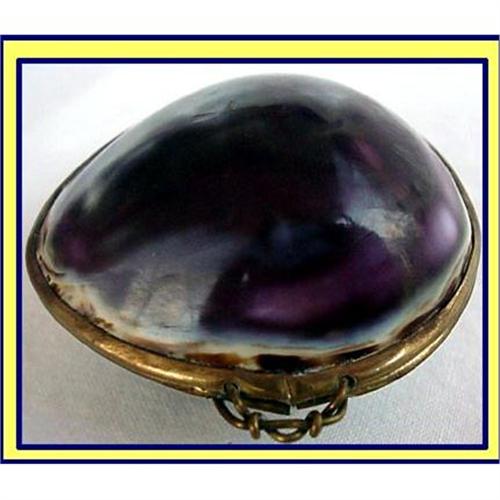 Sea shell set in a brass frame, forming a beautiful little coin purse. Natural purple, pink, white mottled colour. Maximum length is 2 1/4inches.<BR>Very good condition.