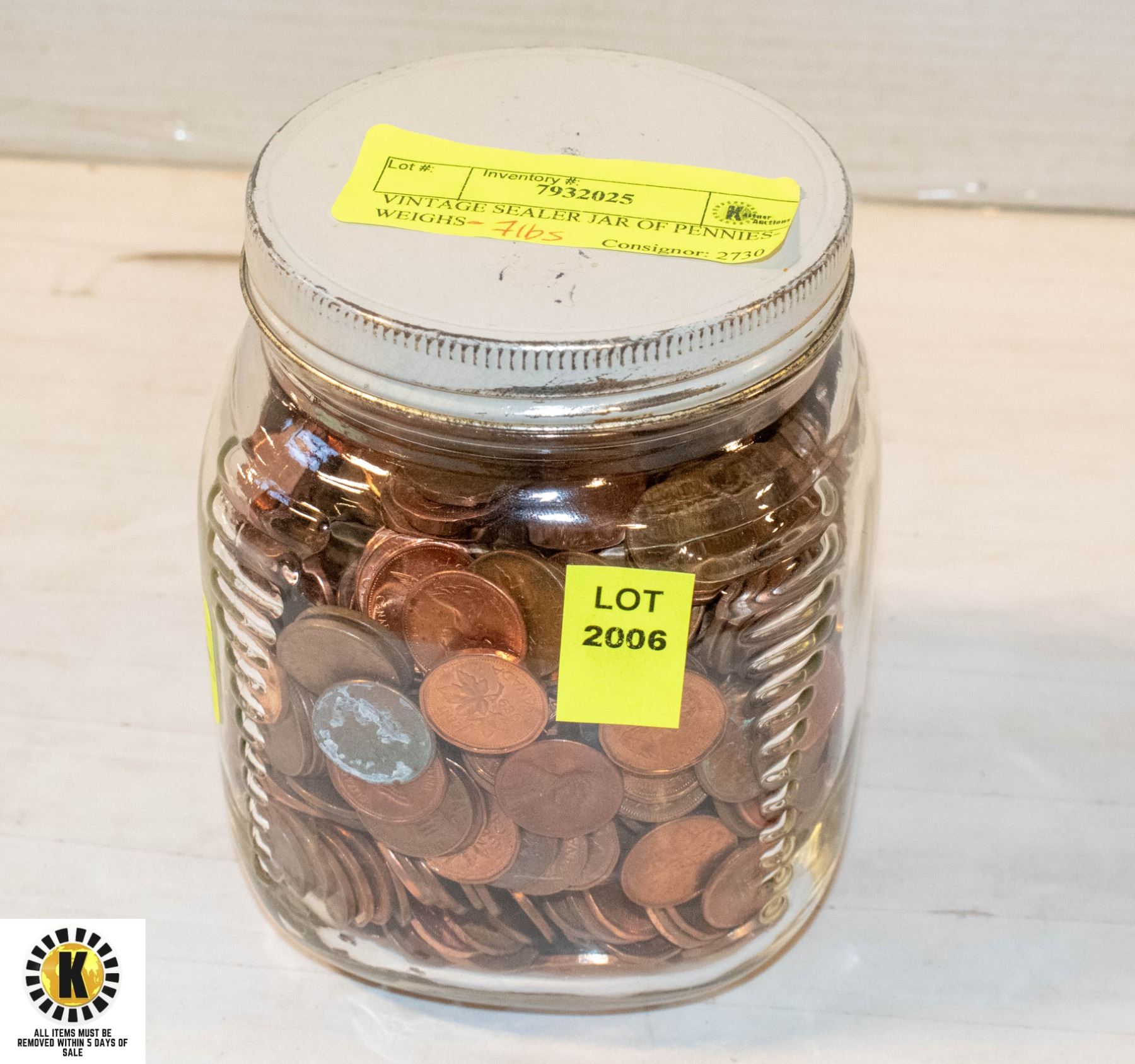 VINTAGE SEALER JAR OF PENNIES- WEIGHS