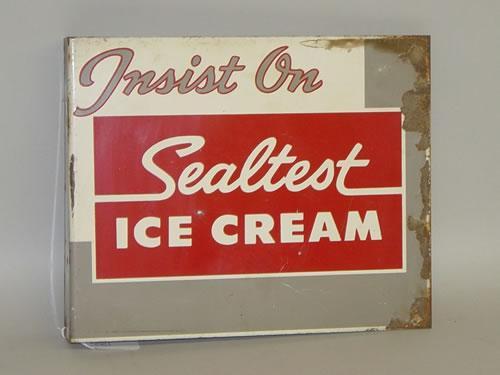 VINTAGE SEALTEST ICE CREAM TIN ADVERTISING SIGN "INSIST ON SEALTEST ICE CREAM" W/ WALL BRACKET SIDE (9 3/4" X 12")