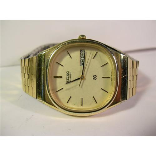 VERY VINTAGE VERY RETRO VERY COOL SEIKO GENT'S FOUR 4 JEWEL DAY/DATE QUARTZ OVAL/RETRO SHAPED WATCH WITH ORIGINAL COORDINATING LINK STYLE SIGNED SEIKO BRACELET IN GOOD CONDITION. THERE IS CONSIDERABLE WEAR IN AREA'S, WHERE THE GOLD IS FADING, BUT MECHANICALLY IT KEEPS PERFECT SEIKO JAPAN QUARTZ TIME!