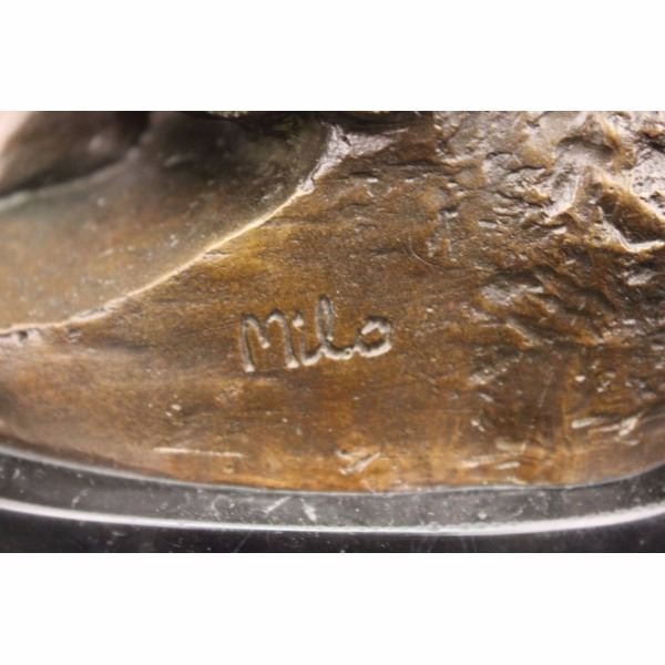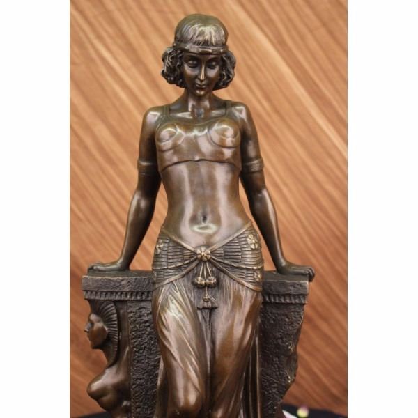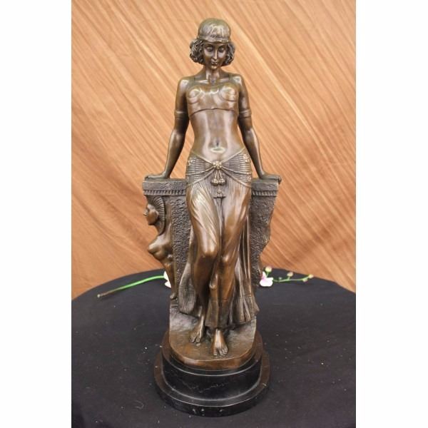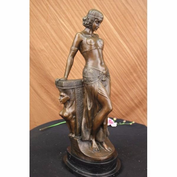 This is an expressive and very decorative bronze statue depicting a semi nude Egyptian princess Beauty in erotic and very naturalistic pose standing next to rock. She seems to be very dreamily and seems to listen to the silent of the beautiful nature or the rushing water of the sea. The bronze sculpture shows a masterful and fine detailed execution and is signed by the sculptor Milo on the bronze base. This striking bronze is brought to life with its rare and complex firery blended patina. The Dark Brown tones are actually the amazing applications of a patina blend over bronze .Shipping/Freight and Handling all included in price. This bronze stands 22" Tall 10" Wide and 7 1/2" Deep. Casted in USA using the lost wax method. Notice the authenticity of this recast of the original sculpture by examining the head torso and hand positions. Poor reproductions do not use the original mold and create their sculptures based on artist's renditions. Notice the magnificent application of this patina blend which will was fused into the bronze to last for generations. This is an expressive and very decorative bronze statue depicting a semi nude Egyptian princess Beauty in erotic and very naturalistic pose standing next to rock. She seems to be very dreamily and seems to listen to the silent of the beautiful nature or the rushing water of the sea. The bronze sculpture shows a masterful and fine detailed ex