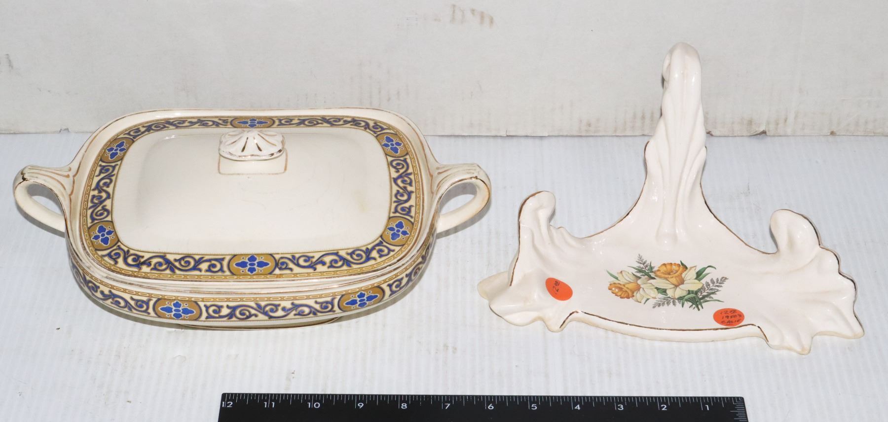 SERVING DISH STAMPED IN ENGLAND. PLATE DISPLAYER STAMPED IN CALI (1950'S)