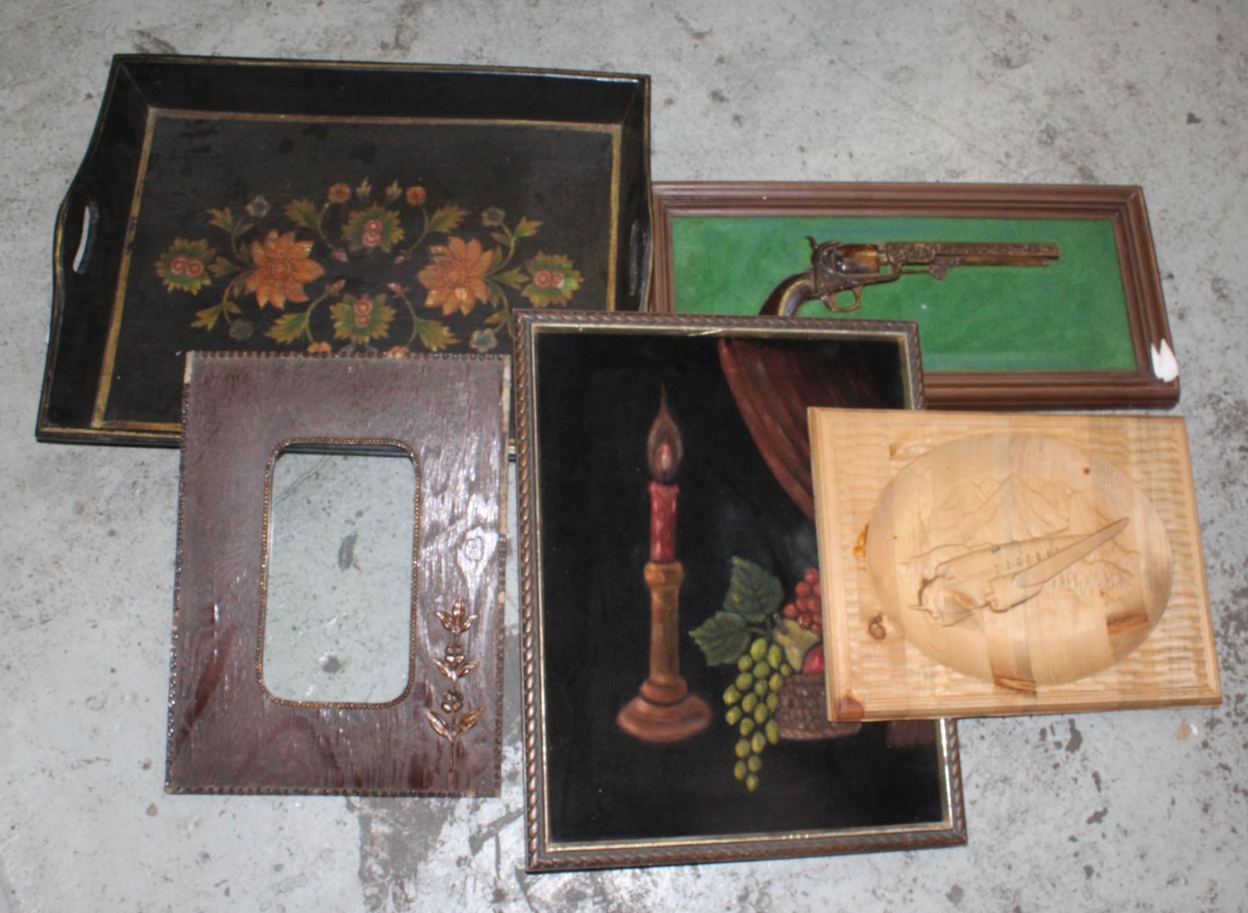 VINTAGE SERVING TRAY AND ASSORTED PICTURES