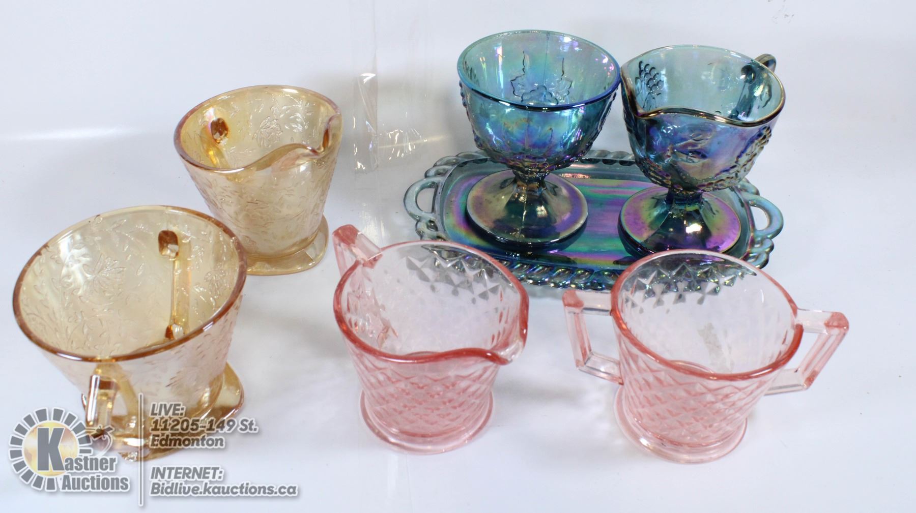CREAM 2 DEPRESSION GLASS W/3 PC CARNIVAL GLASS SET