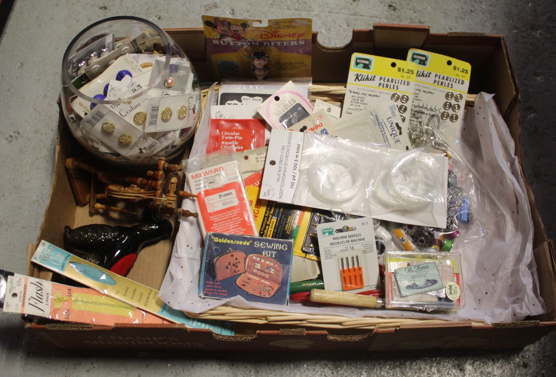 SEWING MACHINE BOBBINS W/THREAD, DOG PIN CUSHION HOLDER, KNIT TALLY, SINGER YELLOW BAND NEEDLES (UNUSED), BAG OF THIMBLES, LARGE GLASS CONTAINER OF UNUSED BUTTONS (WOOLCO & KMART), AERO TWIN-PIN CIRCULAR KNITTING NEEDLES & MORE