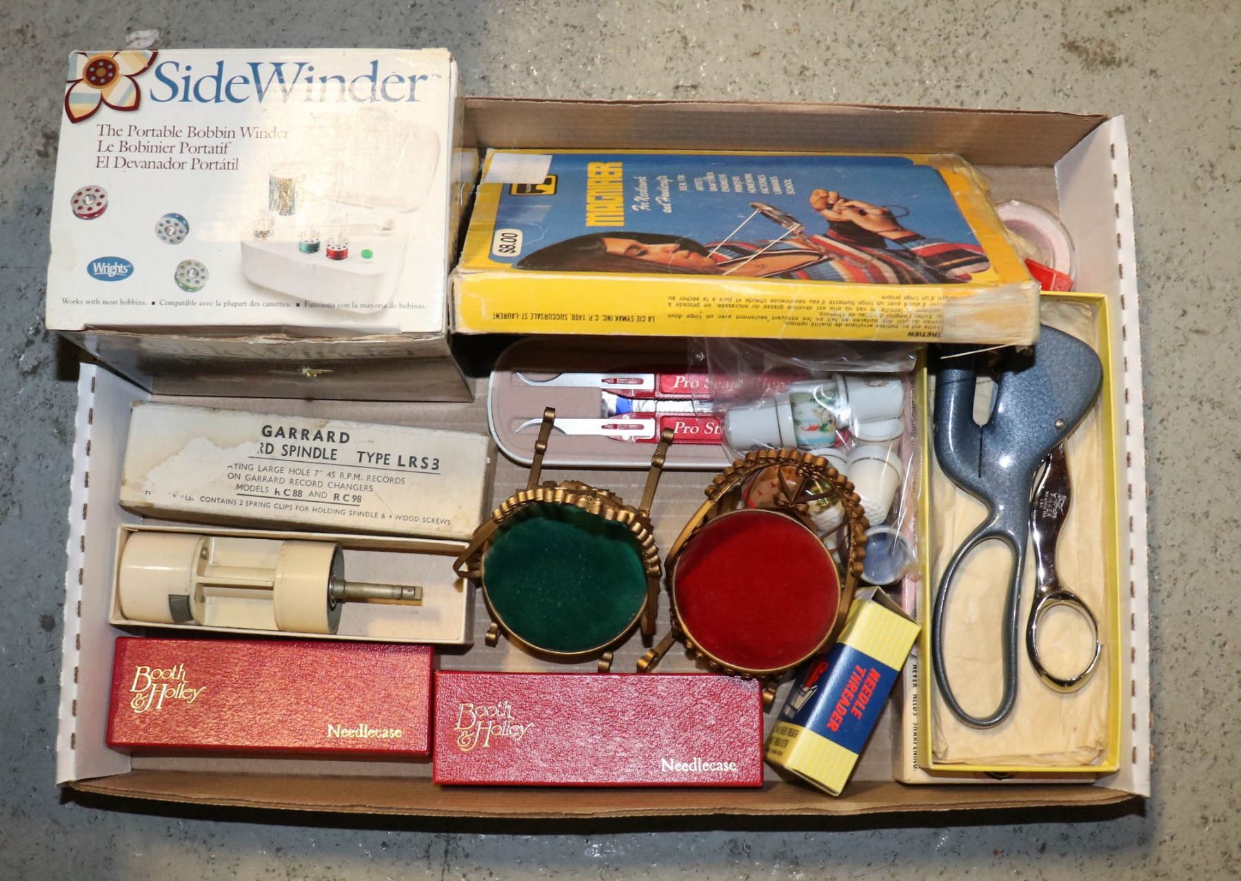 RIPPER, MAGNIFIER, SIDE WINDER PORTABLE BOBBIN WINDER (NEW), 2 NEEDLE ROCKING CHAIR PIN CUSHIONS, FLORIAN PINKER, 2 WOODEN NEEDLE CASES, AUTOMATIC NEEDLE THREADER (NEW), GARRARD SPINDLE & MORE