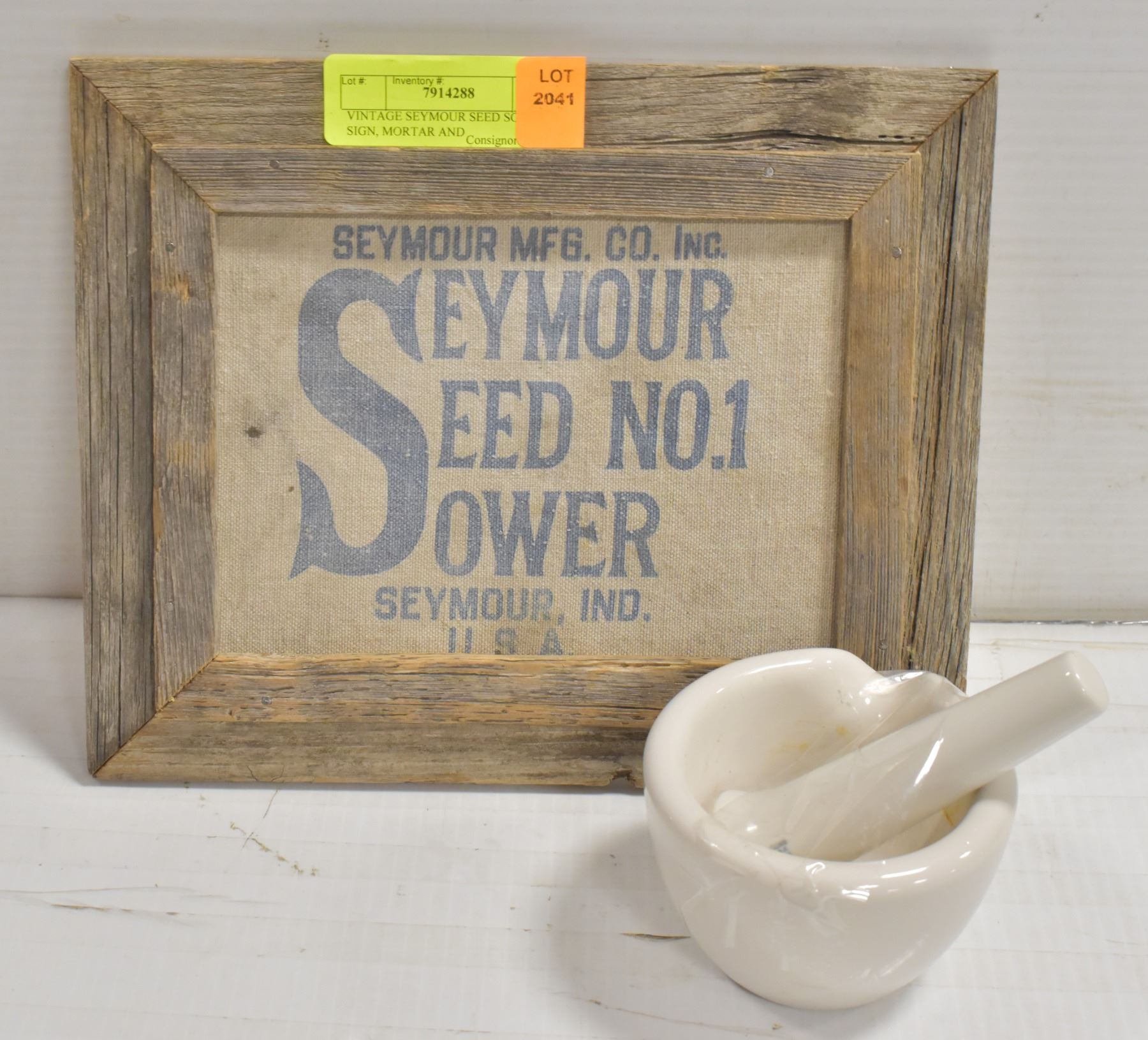 VINTAGE SEYMOUR SEED SOWER SIGN, MORTAR AND