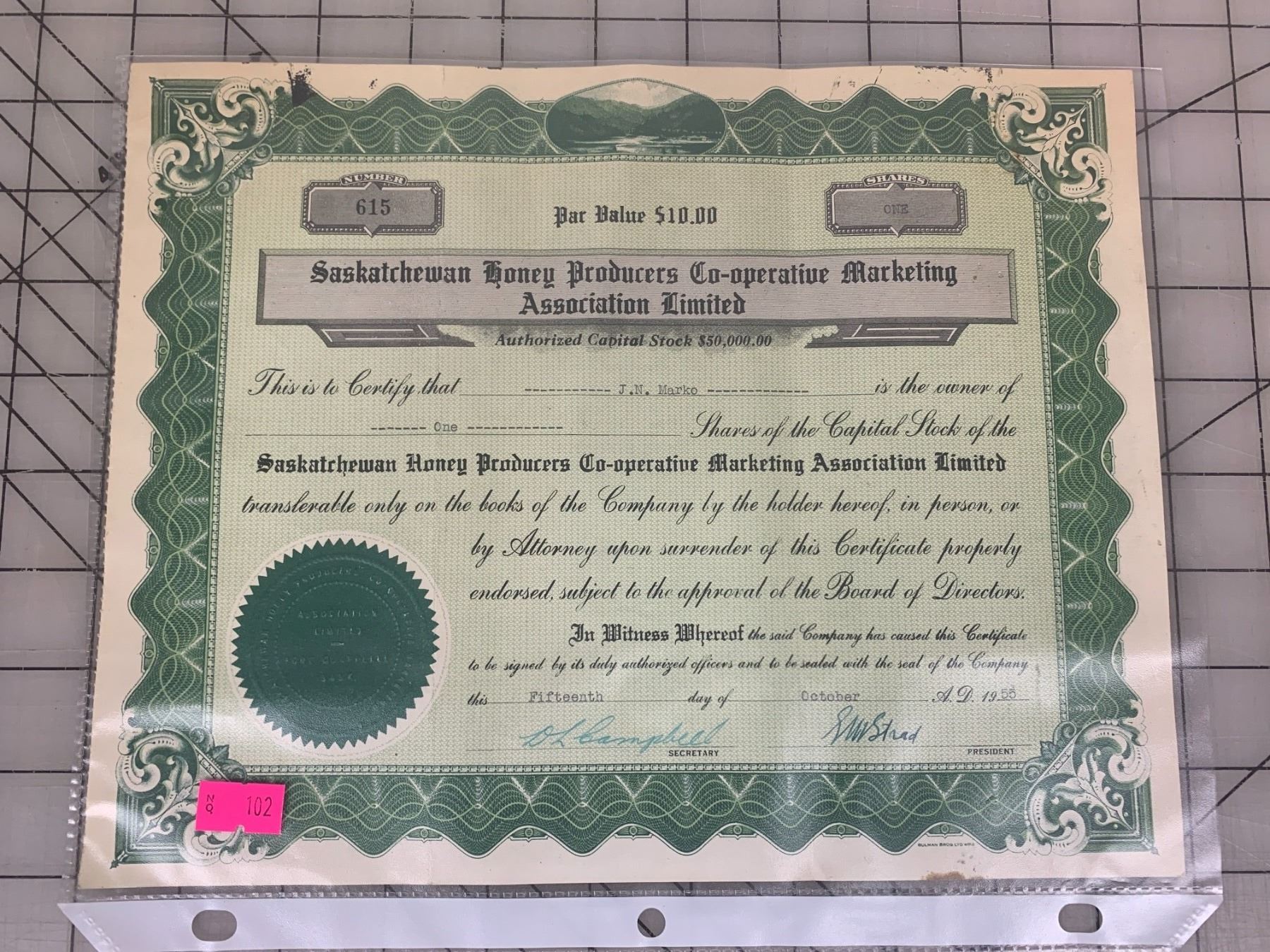VINTAGE SHARE STOCK CERTIFICATE SASKATCHEWAN HONEY PRODUCERS