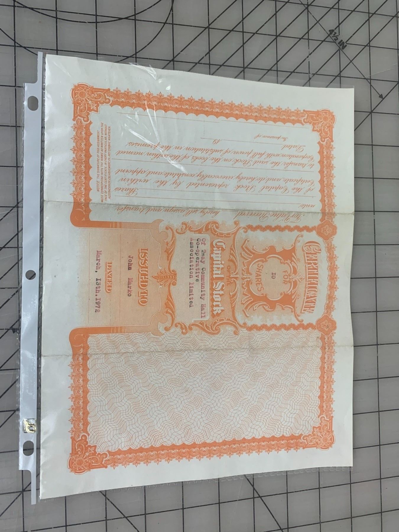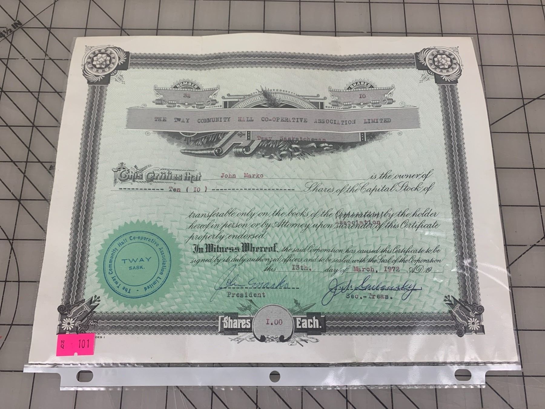VINTAGE SHARE STOCK CERTIFICATE TWAY SASK COMMUNITY HALL
