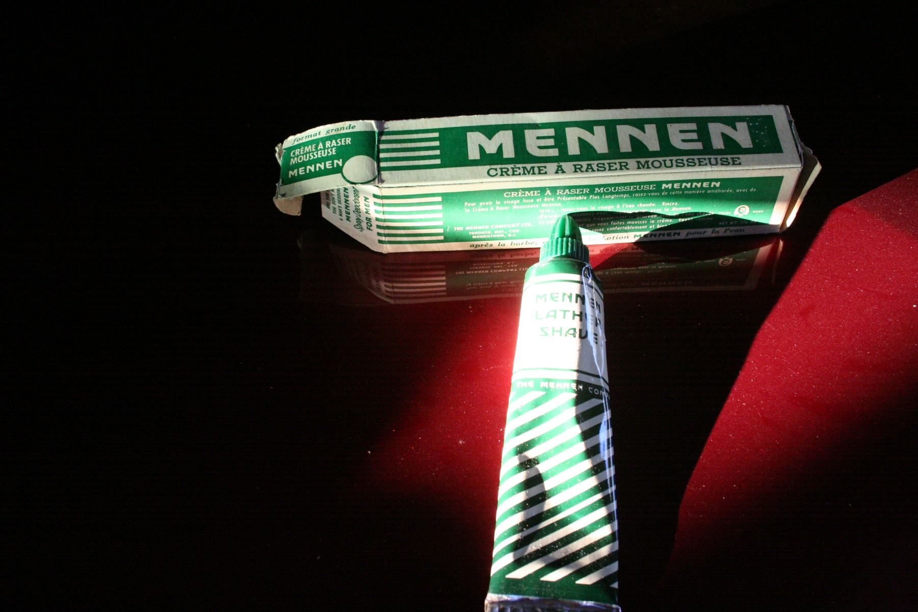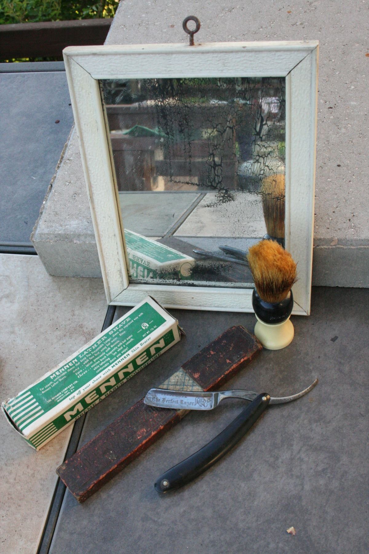 THE PERFECT RAZOR STRAIGHT RAZOR, MENNEN SHAVE CREAM IN ORIGINAL BOX, VINTAGE RUBBERSET SHAVING BRUSH.