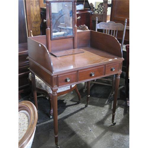 WRITING DESK: Vintage Sheraton style mahogany writing desk, top with reeded posts with brass finials flanking a rectangular mirror, reeded legs and casters. 55''h x 32''d x 30''w