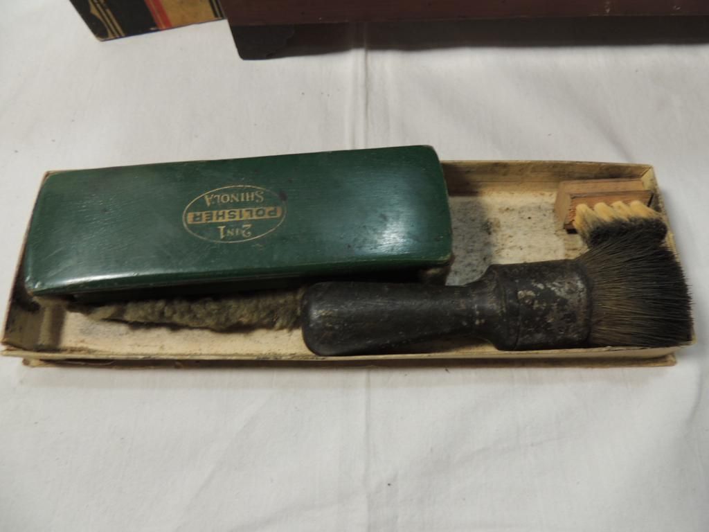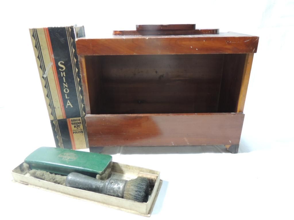 SHINOLA SHOE SHINE KIT AND SHOE SHINE BOX. VINTAGE. AS SHOWN. SEE PHOTO FOR MORE DETAILS.