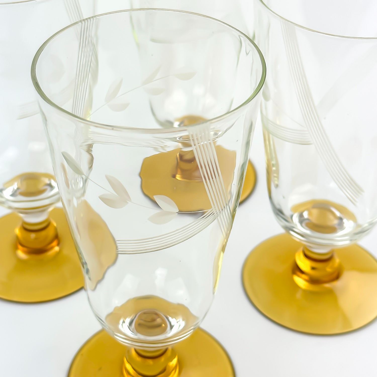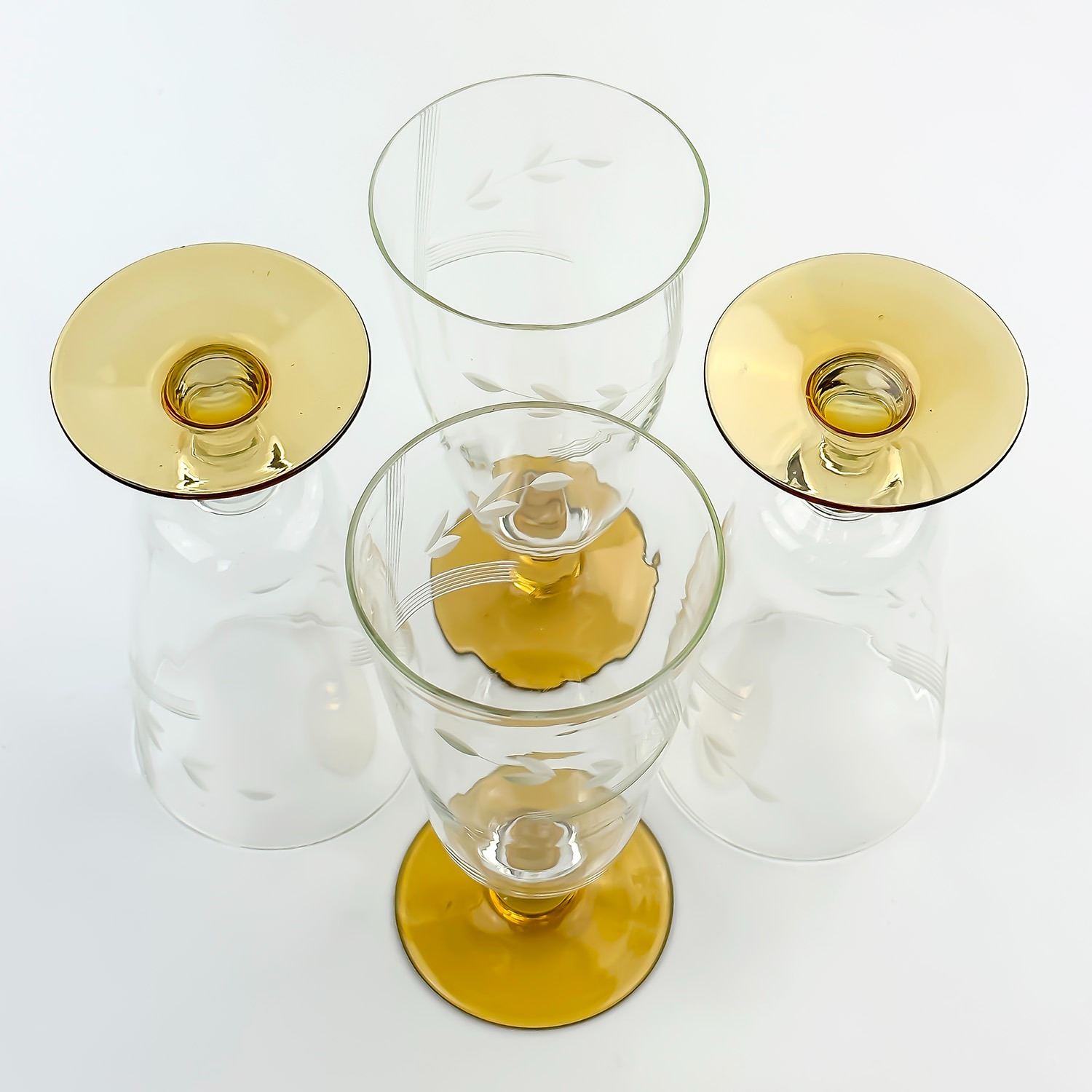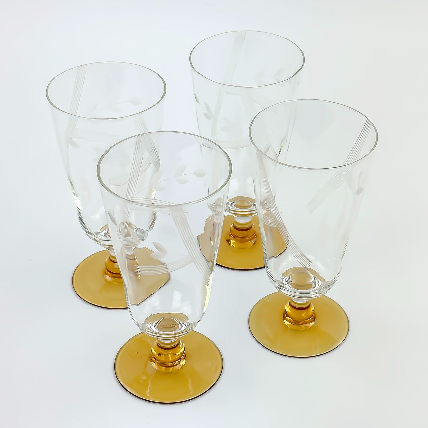 #8565 - 4 PARFAIT GLASSES WITH AN ETCHED ART DECO STYLE DESIGN. GLASS MEASURES: 5.5” (14 CM) TALL BY 2.5” (6.5 CM) DIAMETER BASE AND 2.75” (7 CM) DIAMETER TOP