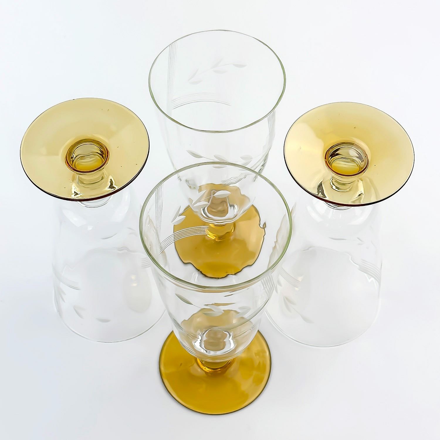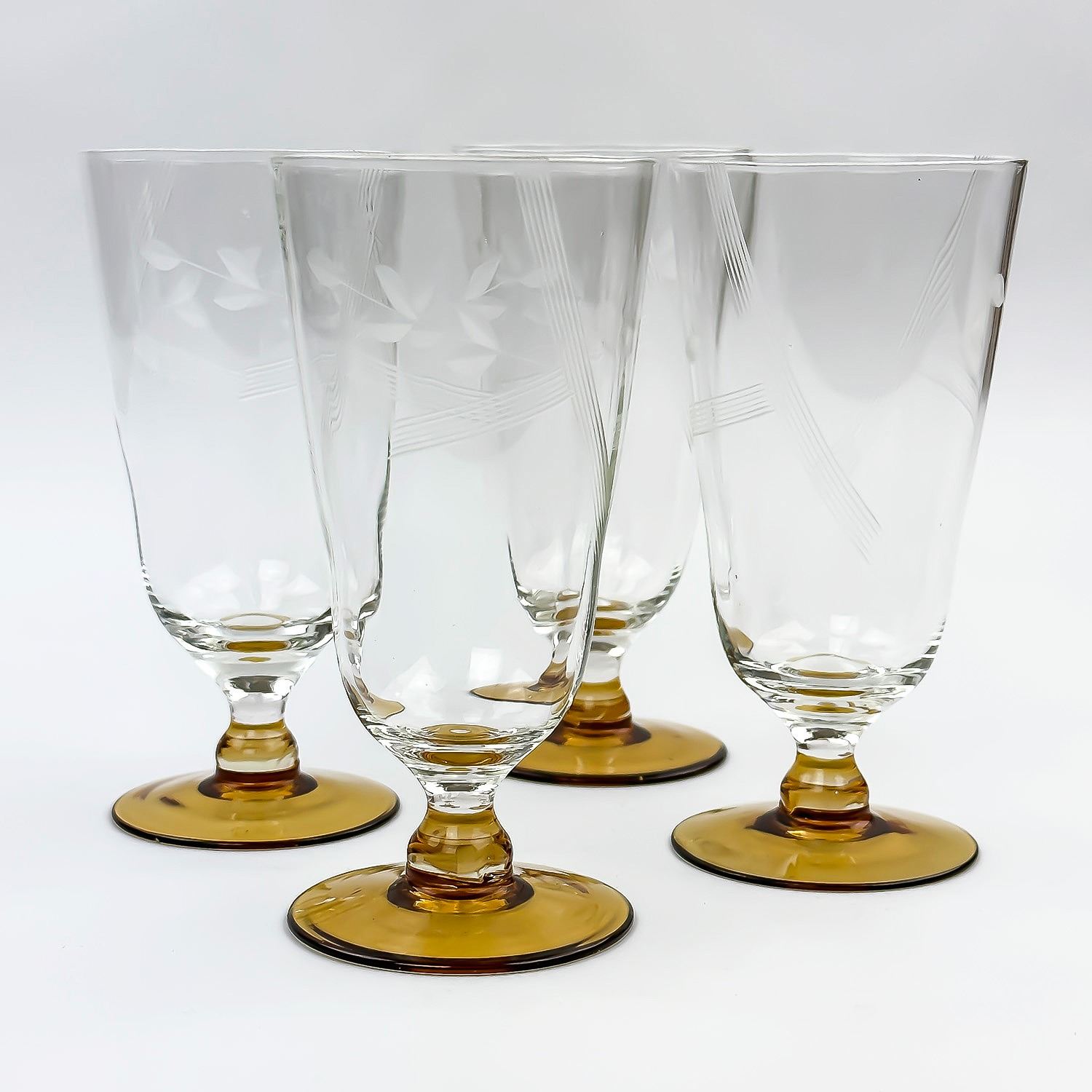 #8945 - 4 PARFAIT GLASSES WITH AN ETCHED ART DECO STYLE DESIGN. GLASS MEASURES: 5.5” (14 CM) TALL BY 2.5” (6.5 CM) DIAMETER BASE AND 2.75” (7 CM) DIAMETER TOP