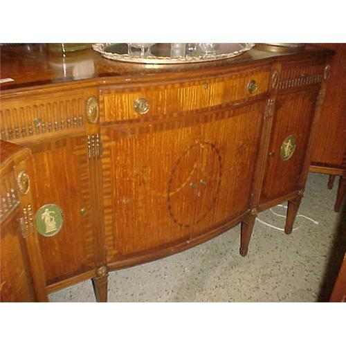 Wonderful Inlaid Sideboard Server Buffet Chest of Drawers with Three Top Drawers, Three Interior Center Drawers and Two Storage Cabinets on the sides. There are two Wedgwood style plaques adorning the side doors and exquisite carved fluted details along the top front of the piece. This piece has beautiful mixed wood inlays and all original hardware. The top is Satinwood and is banded in Tiger Mahogany.