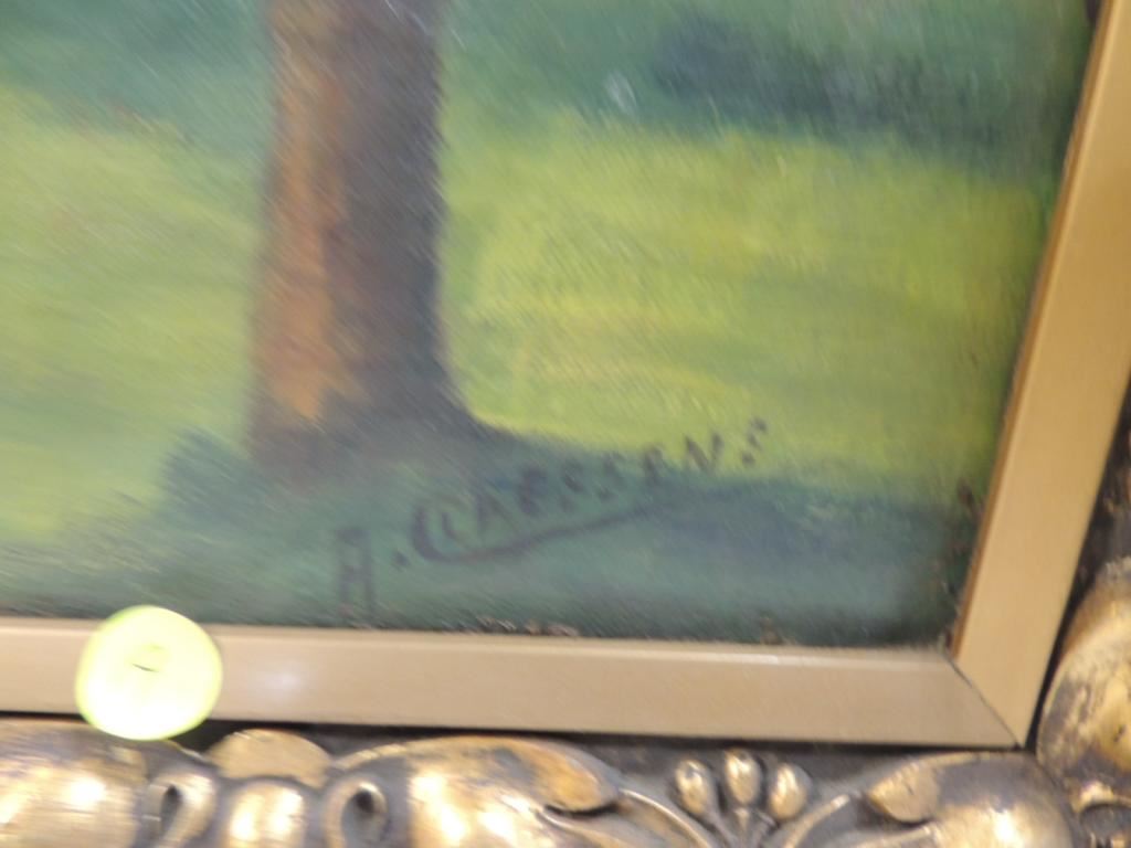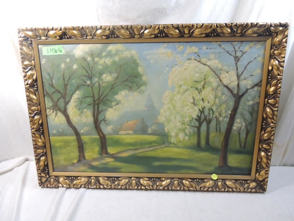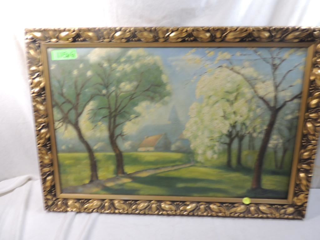 COUNTRY COTTAGE IN THE DISTANCE TREES ALONG NARROW DIRT ROAD. DECORATEIVE CARVED WOODEN GOLD PAINTED FRAME.