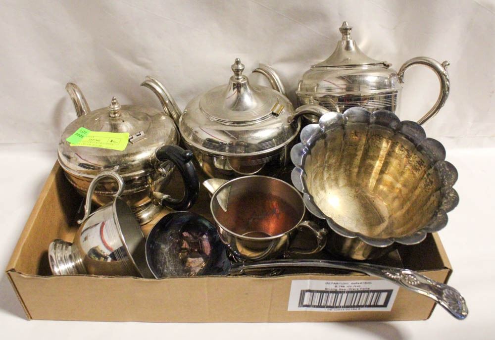 VINTAGE SILVER-COLOR COPPER TEAPOTS, CREAM, SUGAR,