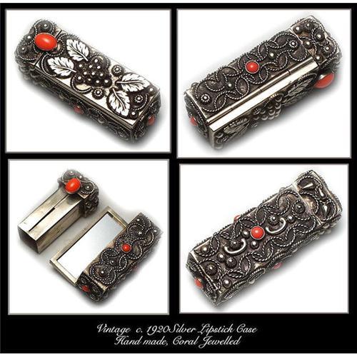 If you are REALLY interested in this item, please note that for Ebay Live Auction only bids at or above $130 will be successful and meet our reserve. Beautiful hand made silver lipstick case with coral stones and mirror inside. Marked with numbers 61, no other marking but tested as Sterling Silver. Excellent condition, dimension : 2-3/8 x 7/8 x 7/8".