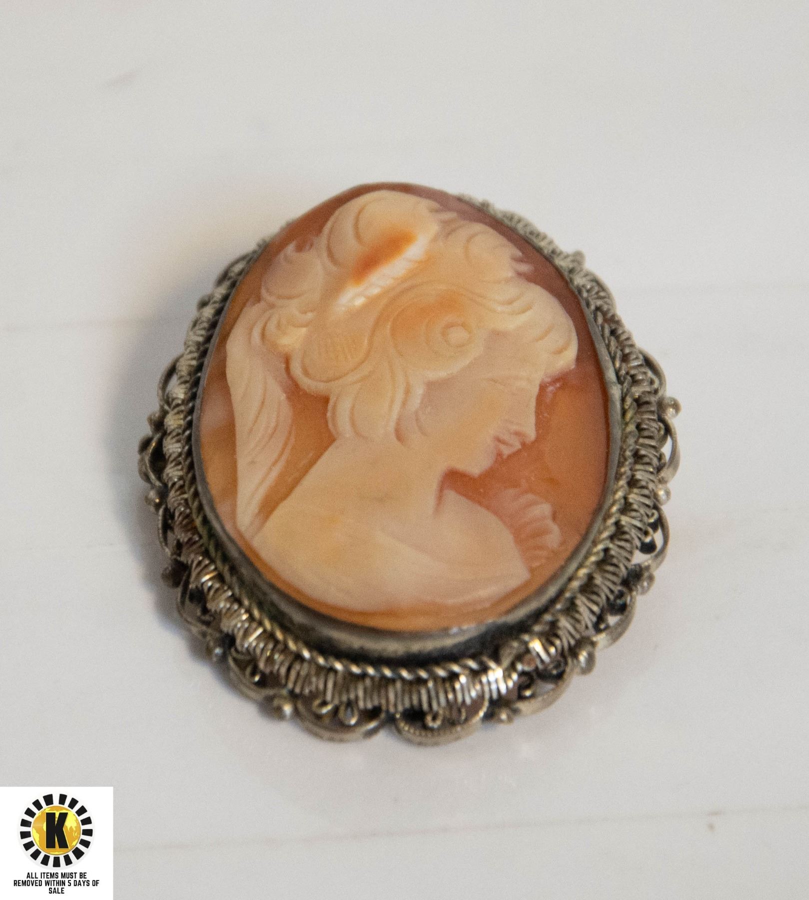 VINTAGE SILVER FILIGREE CAMEO BROOCH PIN