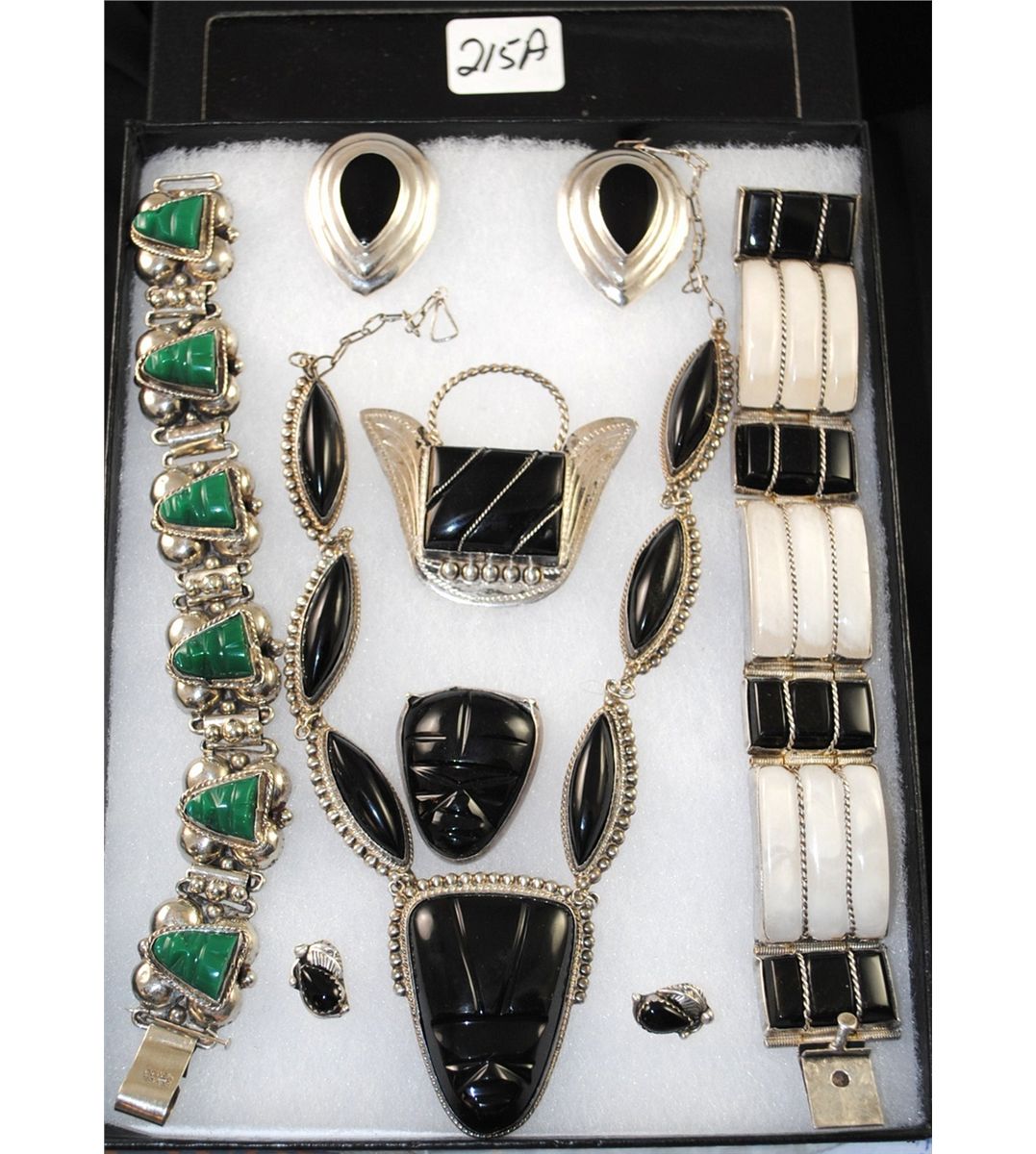VINTAGE SILVER JEWELERY FROM MEXICO - NECKLACE WITH MATCHING EARRINGS, TWO CARVED BRACELETS, TWO BROOCHES & A PAIR OF EARRINGS - SOLD PER SET OR PIECE TIMES 6 - VERY NICE!