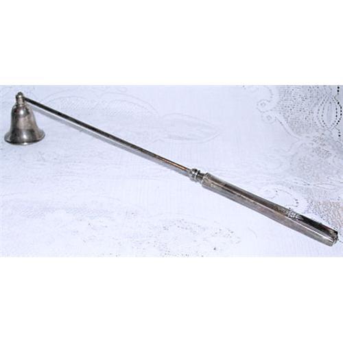 LONG, ELEGANT, USEFUL!<p>Handle could be sterling...believe to be silver plate.<p>Will polish before shipping if requested.<P>No hallmark, c1940.<P>15 7/8" long; 5/8" wide handle; bell shape snuffer - 2 1/4" long, 1 3/4" diameter.<P>LOVELY SAFE WAY TO EXTINGUISH CANDLES.