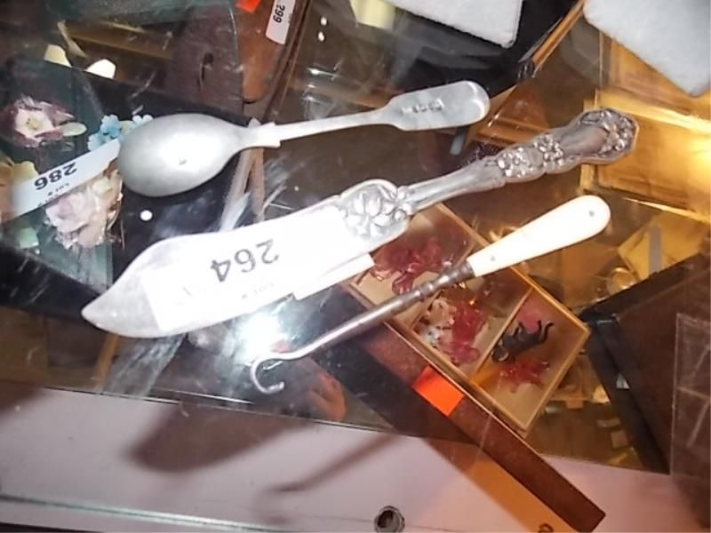 VINTAGE SILVER SPOON WITH HALL MARKS, BUTTER KNIFE AND IVORY HOOK