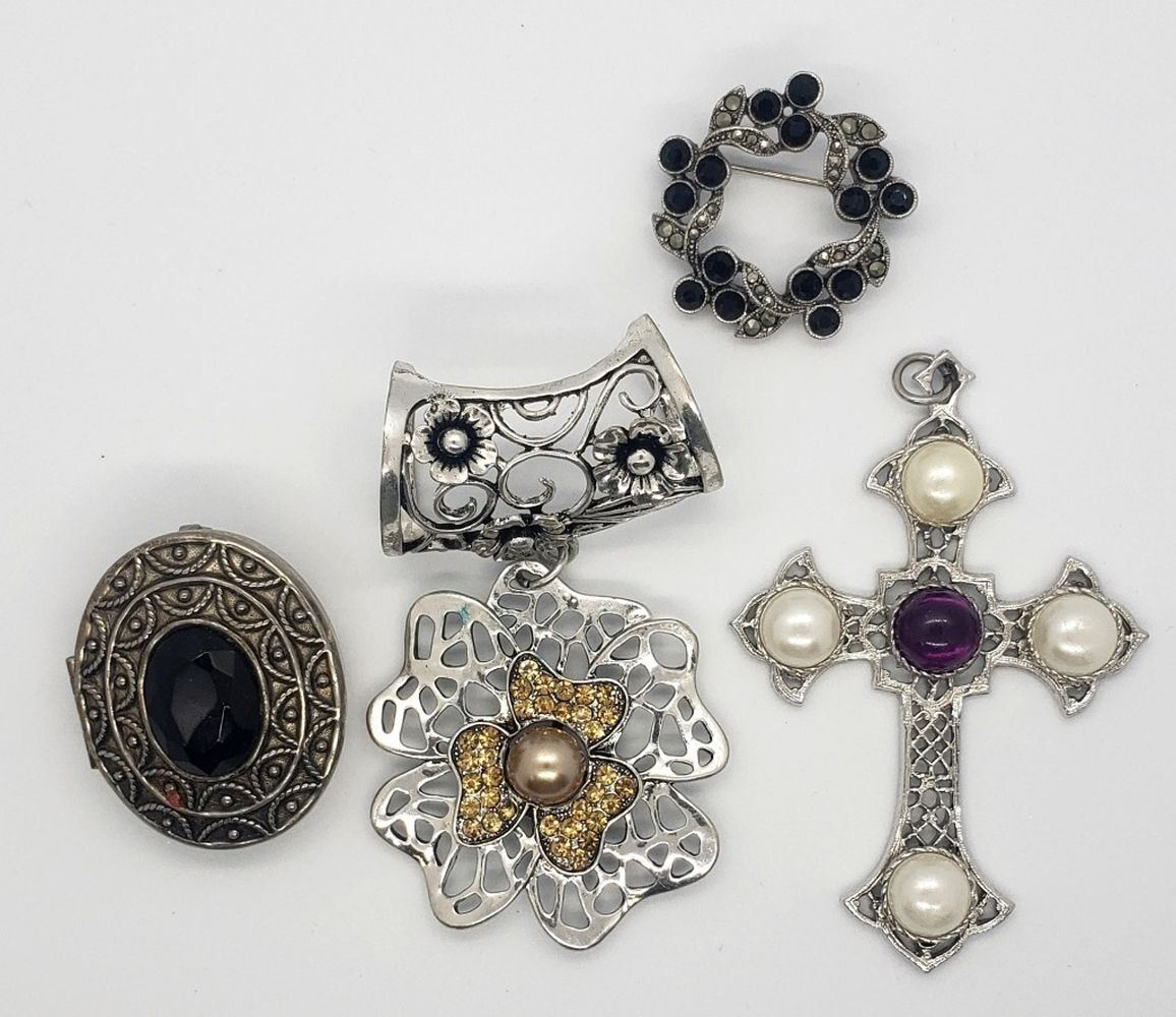 (1)GB SIGNED FLOWER PENDANT WITH FAUX PEARLS & RHINESTONES (1)SARAH COVENTRY WITH PURPLE LUCITE AND FAUX PEARLS (1)MARCASITE WREATH BROOCH WITH BLACK RHINESTONES & (1)LOCKET/BROOCH WITH LARGE BLACK RHINESTONE