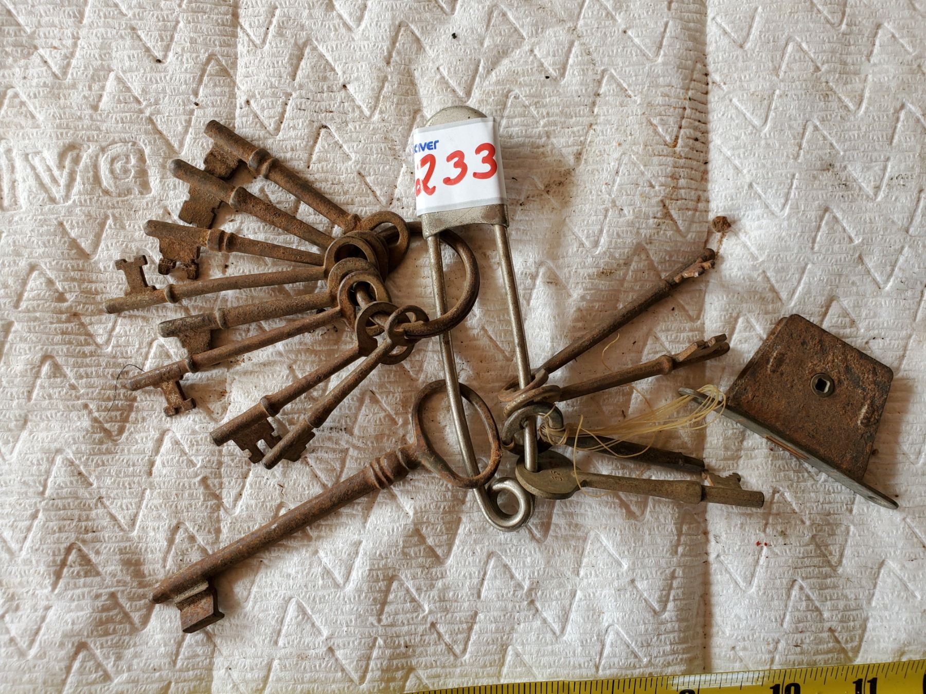 VINTAGE SKIRT PIN WITH 12 ASSORTED VINTAGE SKELETON KEYS