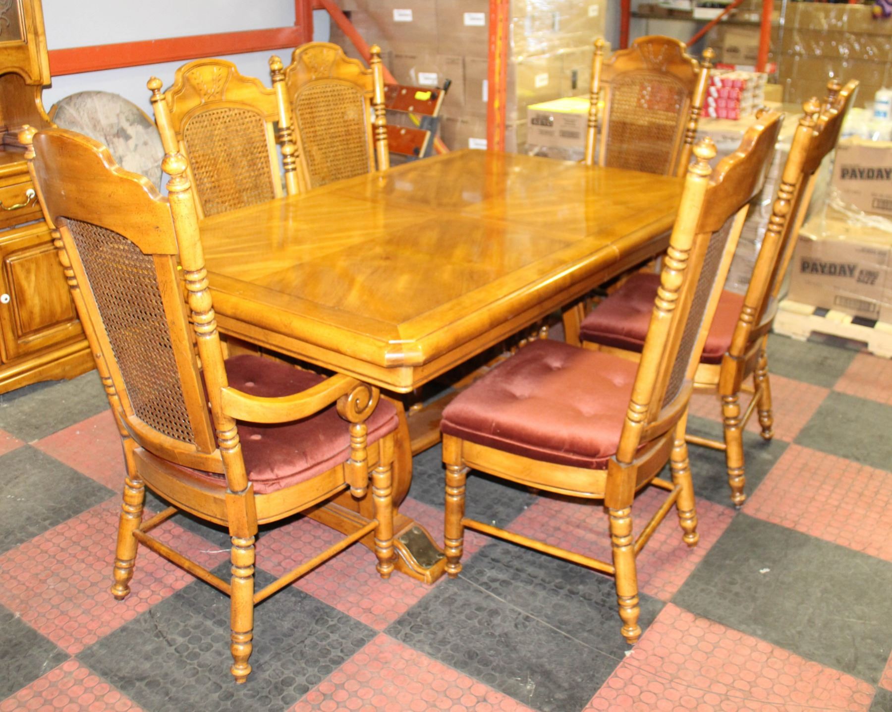 OAK TABLE WITH 2 CAPTAINS CHAIRS AND 4 REGULAR CHAIRS. (2 EXTRA TABLE LEAFS; EXPANDS TO 96 INCHES)