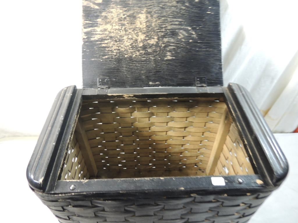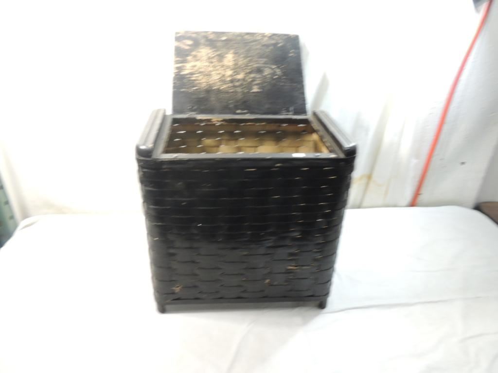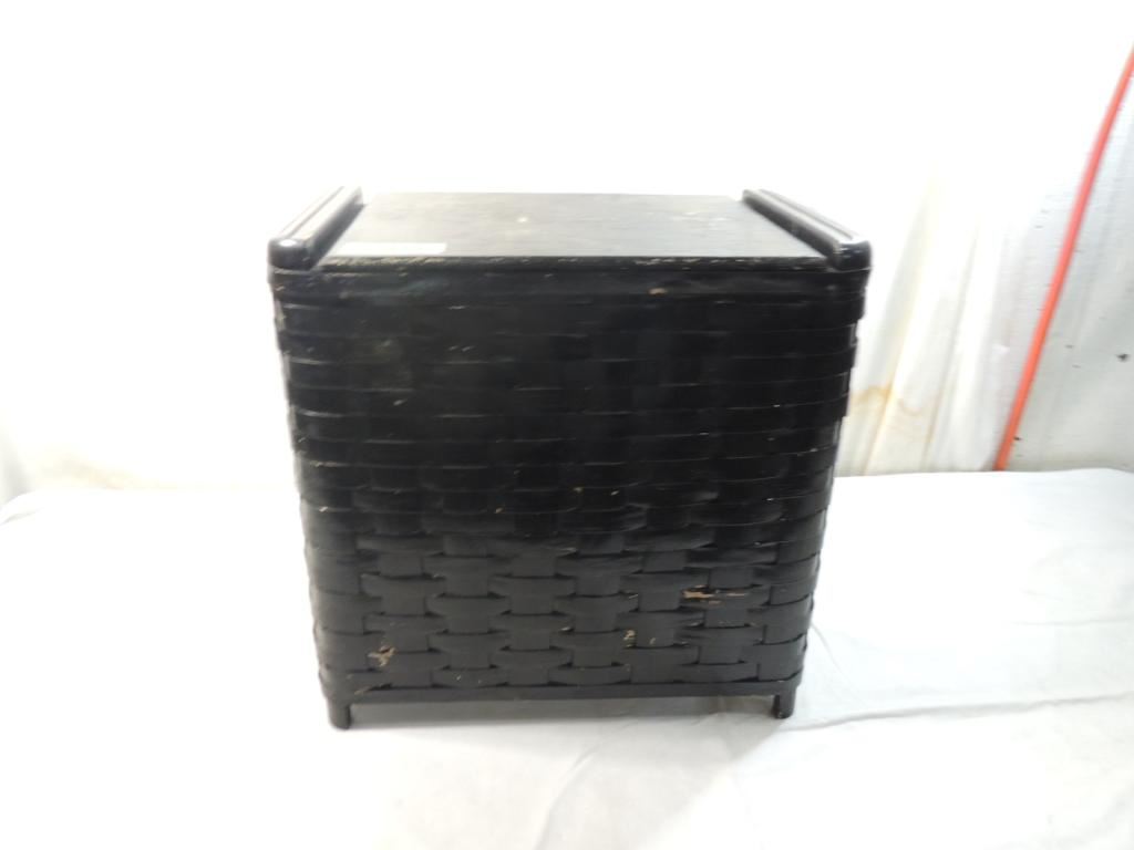 VINTAGE SMALL LAUNDRY HAMPER GARBAGE HAMPER BLACK WOVEN LAUNDRY HAMPER, AS SHOWN SEE PHOTO FOR MORE DETAILS.