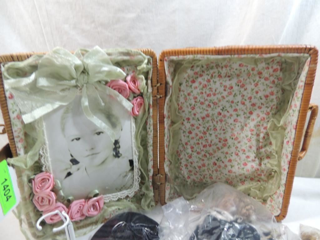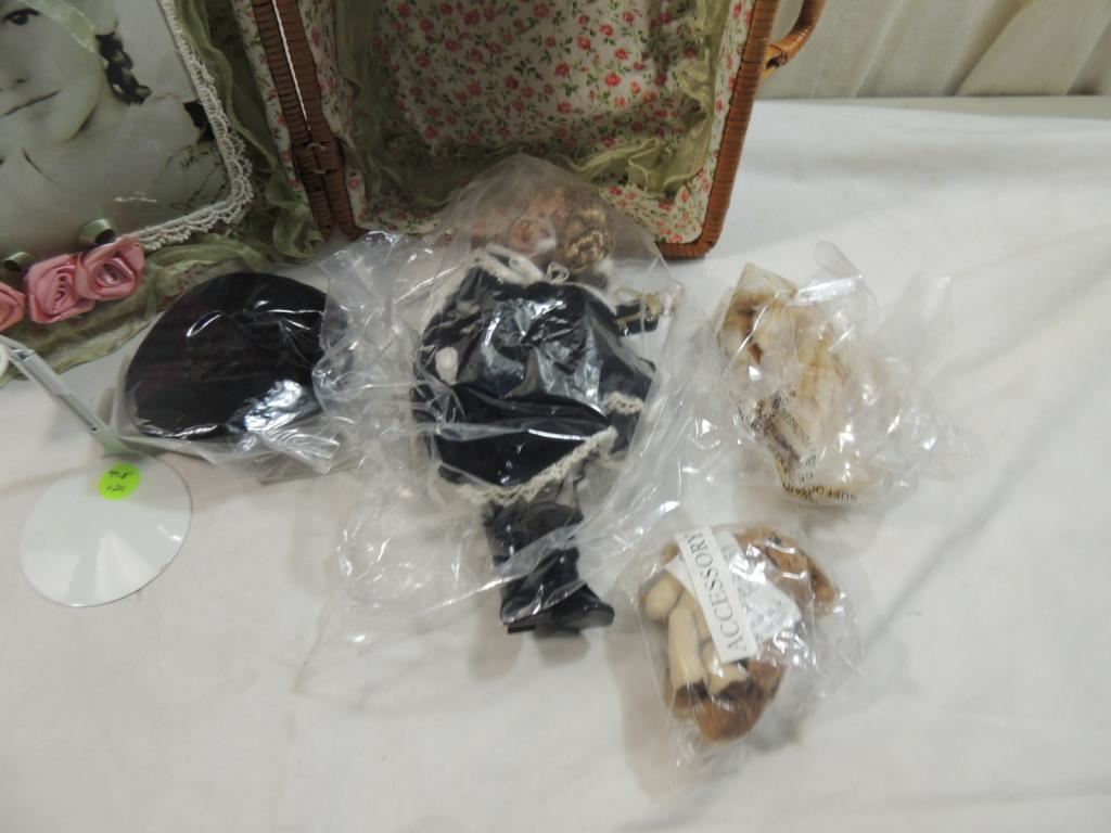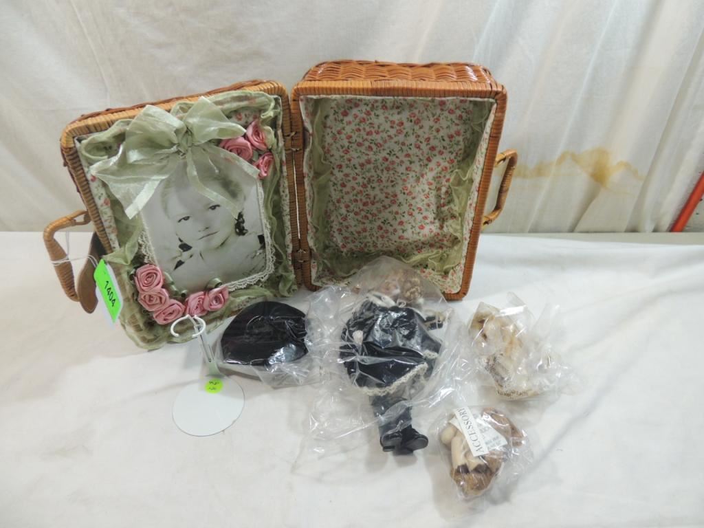 BASKET CASE, SMALL PORCELAIN DOLLS, WOVEN BASKET, DECORATIVE BASKET, STAND, ACCESSORIES, AS SHOWN SEE PHOTO FOR MORE DETAILS