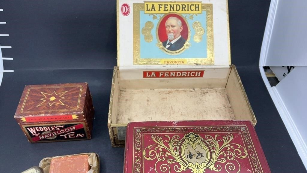 VINTAGE SOAP, TEA BOXES, TINS, CIGAR BOX