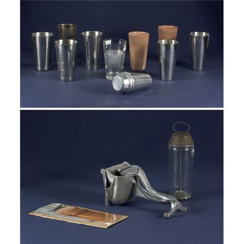 Nine milkshake mixing cups to include six stainless steel, two Plasti-Ware, and one glass ''Mix-Serv''. Also included in the lot is a ''National Dairy Malted Milk Mixer'' hand shaker with a glass bottom and a metal top, an aluminum ''Thompson's Double Malted Malted Milk'' hand shaker mixer cup with lid, a ''Wear-Ever'' aluminum hand press juicer, and a retro milkshake advertising card.