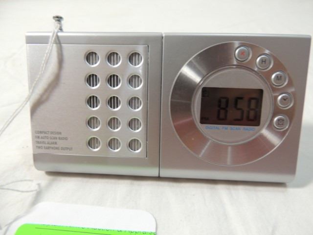 AM FM RADIO, DIGITAL CLOCK, ALARM, WAKE TO MUSIC. AUTO SCAN, TWO EARPHONE OUTLETS, VERY COMPACT DESIGN. LIKE NEW.