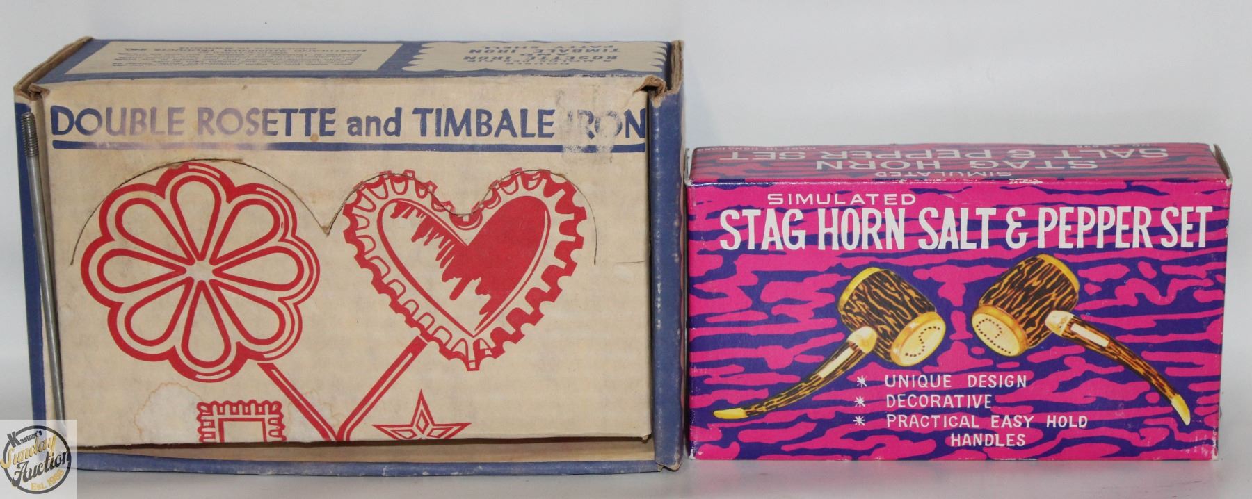 HORNS + NORDIC WARE DOUBLE ROSETTE AND TIMBALE IRON PATTY SHELL UNUSED IN ORIGINAL BOXES **ALL ITEMS MUST BE REMOVED BY 5PM SATURDAY, MAY 17TH 2025. ALL REMAINING ITEMS WILL BE SUBJECT TO A $6.00 PER DAY STORAGE CHARGE. ANY ITEMS REMAINING AFTER MONDAY, JUNE 2ND 2025 WILL BE CONSIDERED FORFEITED. NO REFUNDS WILL BE ISSUED FOR FORFEITED ITEMS. TO SCHEDULE A PICK UP APPOINTMENT CLICK HERE