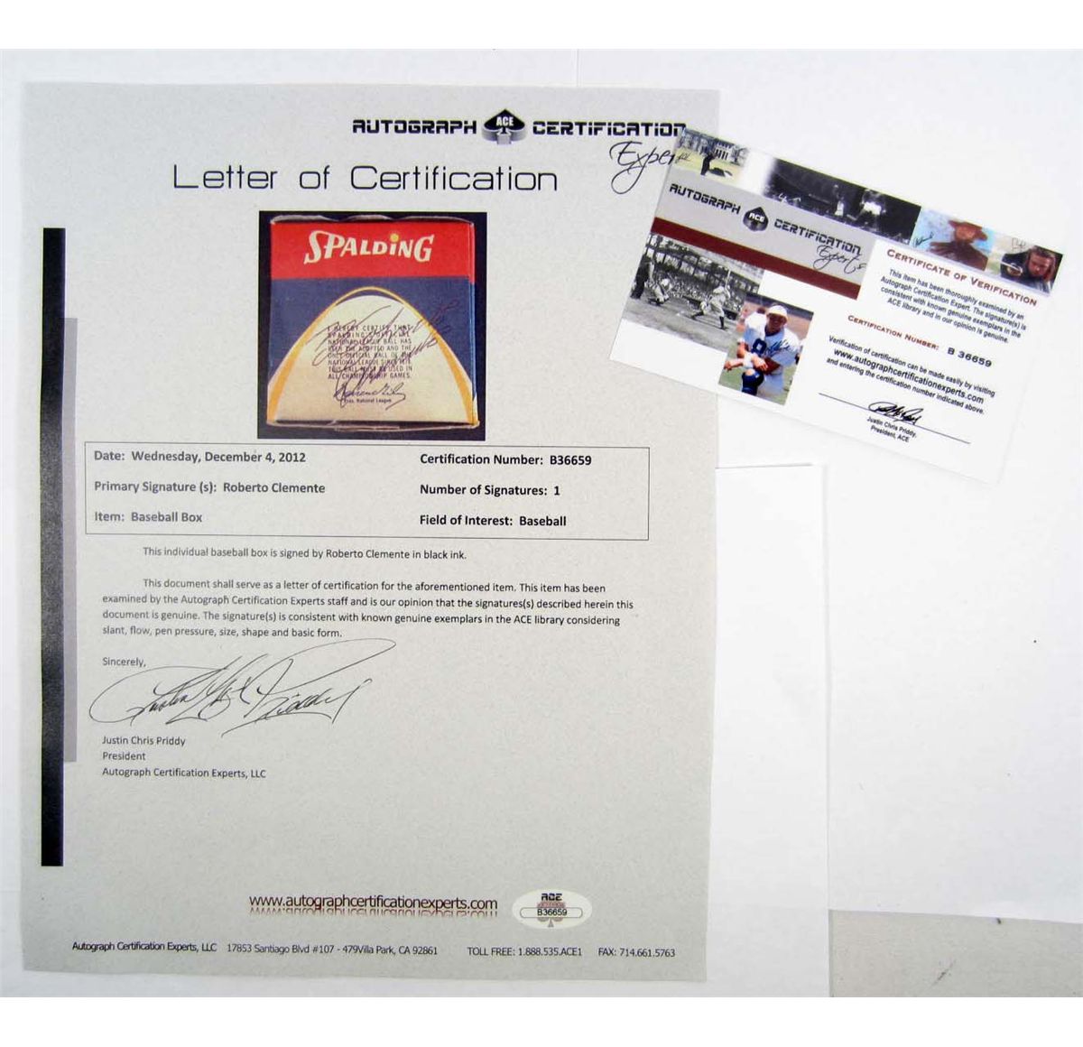baseball box signed by Roberto Clemente in black ink. COA from Ace Autograph Certification.