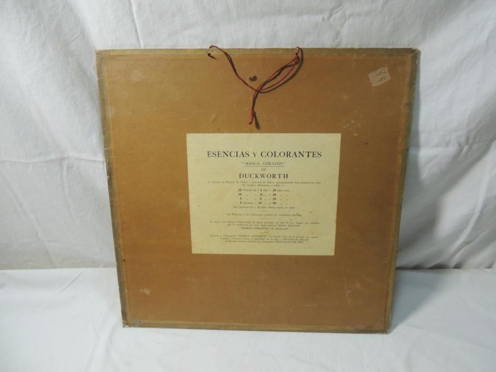 OLD CARD SHOWCARD SHOP SIGN DUCKWORTHS ESSENCES AND COLOURS HEART BRAND SPANISH VERSION SIGN. 16 1/2" X 16 1/2" VINTAGE ADVERTISEMENT. VINTAGE SIGNS. AS SHOWN. SEE PHOTO FOR MORE DETAILS
