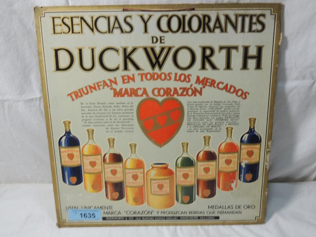 OLD CARD SHOWCARD SHOP SIGN DUCKWORTHS ESSENCES AND COLOURS HEART BRAND SPANISH VERSION SIGN. 16 1/2" X 16 1/2" VINTAGE ADVERTISEMENT. VINTAGE SIGNS. AS SHOWN. SEE PHOTO FOR MORE DETAILS