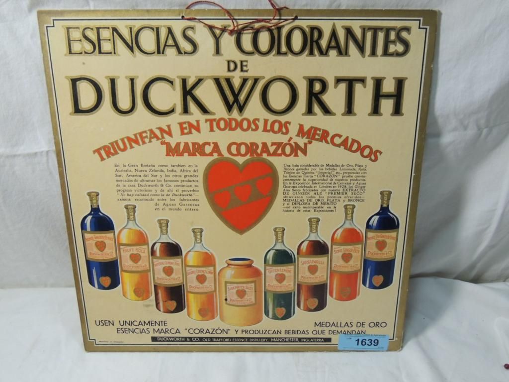OLD CARD SHOWCARD SHOP SIGN DUCKWORTHS ESSENCES AND COLOURS HEART BRAND SPANISH VERSION SIGN. 16 1/2" X 16 1/2" VINTAGE ADVERTISEMENT. VINTAGE SIGNS. AS SHOWN. SEE PHOTO FOR MORE DETAILS