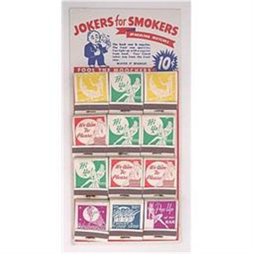 A dozen ?Jokers for Smokers? trick matches on original store display, quintessential joke novelty item from the 1950s! Overall measures 10-1/2" tall x 5" wide. This is vintage collector's items and is intended for decorative and display purposes only.